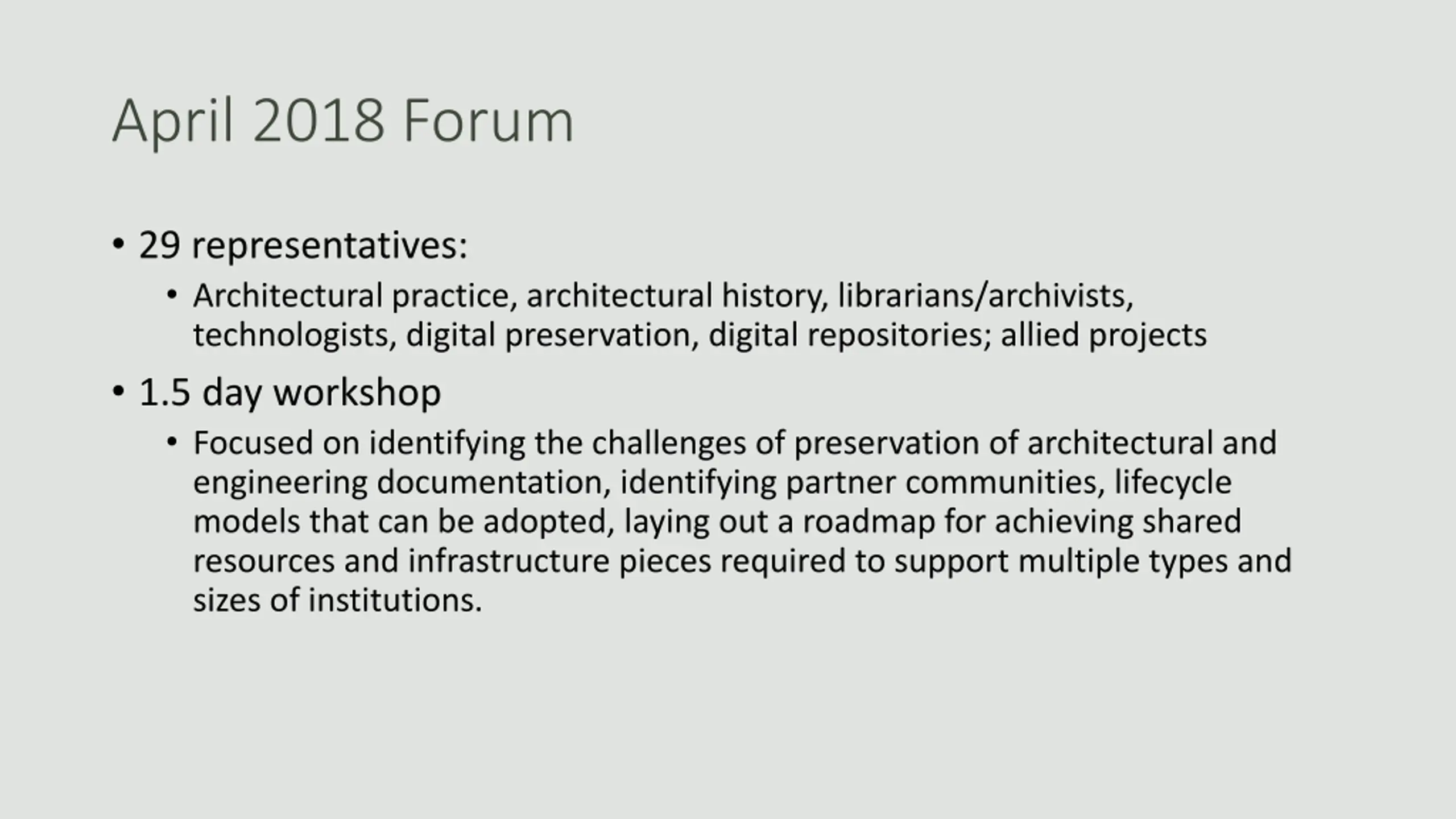 April 2018 Forum 29 representatives: Architectural practice, architectural history, librarians/archivists, technologists, digital preservation, digital repositories; allied projects 1.5 day workshop Focused on identifying the challenges of preservation of architectural and engineering documentation, identifying partner communities, lifecycle models that can be adopted, laying out a roadmap for achieving shared resources and infrastructure pieces required to support multiple types and sizes of institutions.