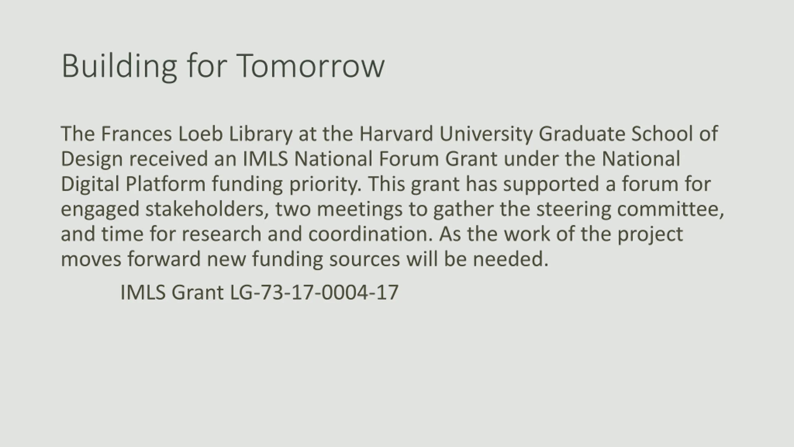 Building for Tomorrow The Frances Loeb Library at the Harvard University Graduate School of Design received an IMLS National Forum Grant under the National Digital Platform funding priority. This grant has supported a forum for engaged stakeholders, two meetings to gather the steering committee, and time for research and coordination. As the work of the project moves forward new funding sources will be needed. IMLS Grant LG-73-17-0004-17