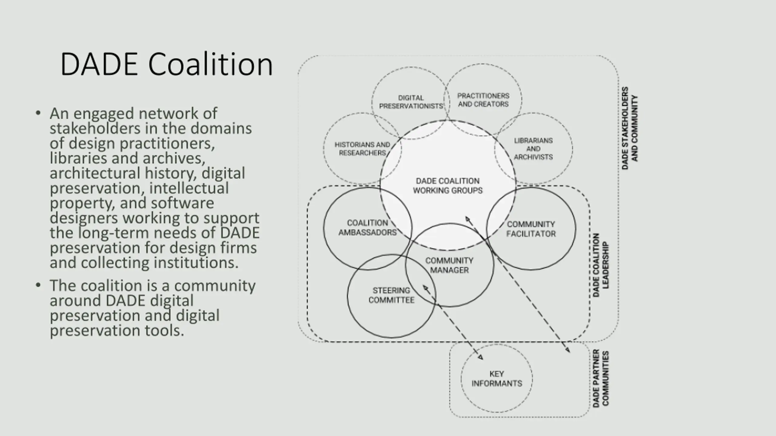 DADE Coalition An engaged network of stakeholders in the domains of design practitioners, libraries and archives, architectural history, digital preservation, intellectual property, and software designers working to support the long-term needs of DADE preservation for design firms and collecting institutions. The coalition is a community around DADE digital preservation and digital preservation tools.