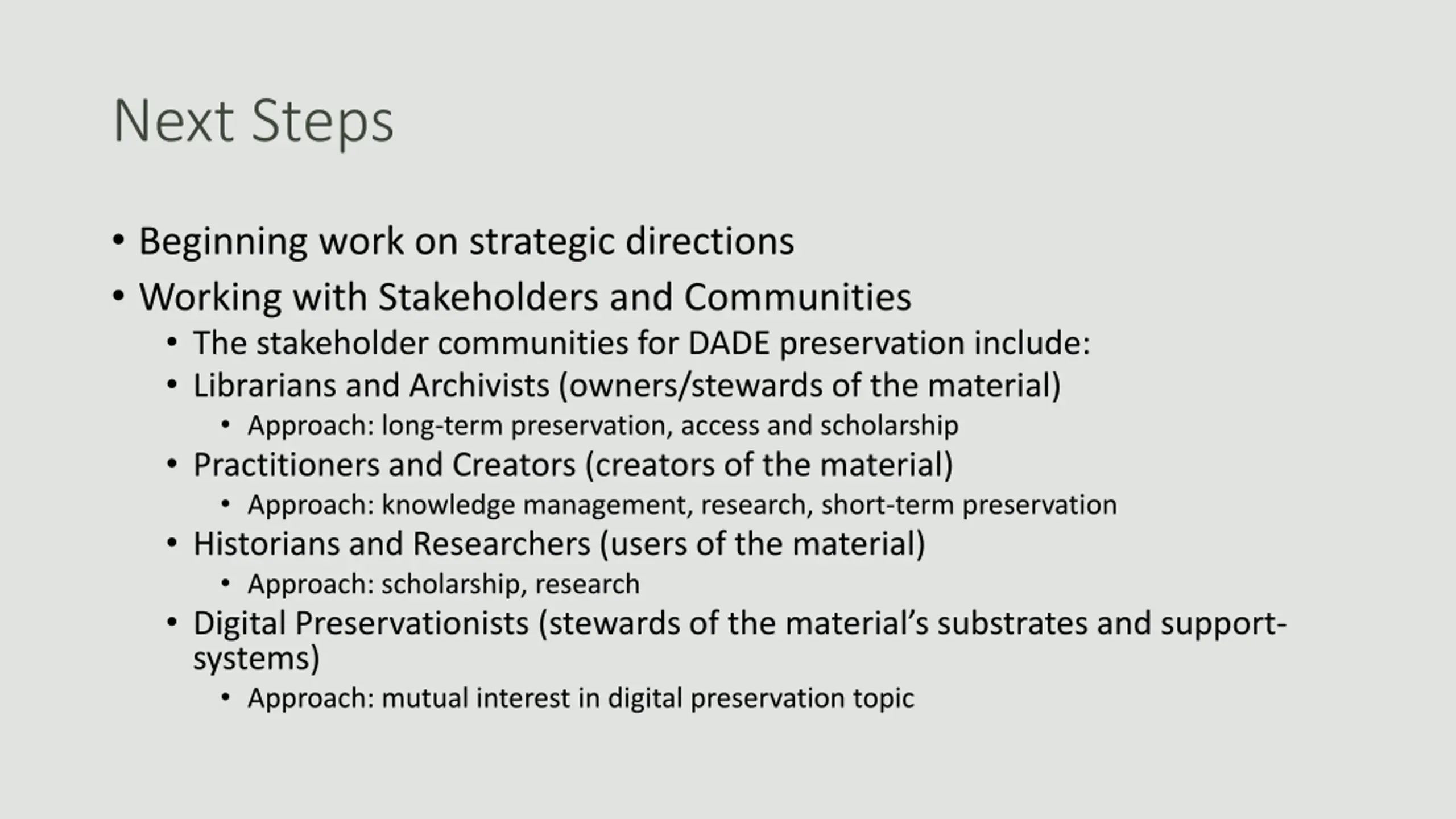 Next Steps Beginning work on strategic directions Working with Stakeholders and Communities The stakeholder communities for DADE preservation include: Librarians and Archivists (owners/stewards of the material) Approach: long-term preservation, access and scholarship Practitioners and Creators (creators of the material) Approach: knowledge management, research, short-term preservation Historians and Researchers (users of the material) Approach: scholarship, research Digital Preservationists (stewards of the material s substrates and support- systems) Approach: mutual interest in digital preservation topic