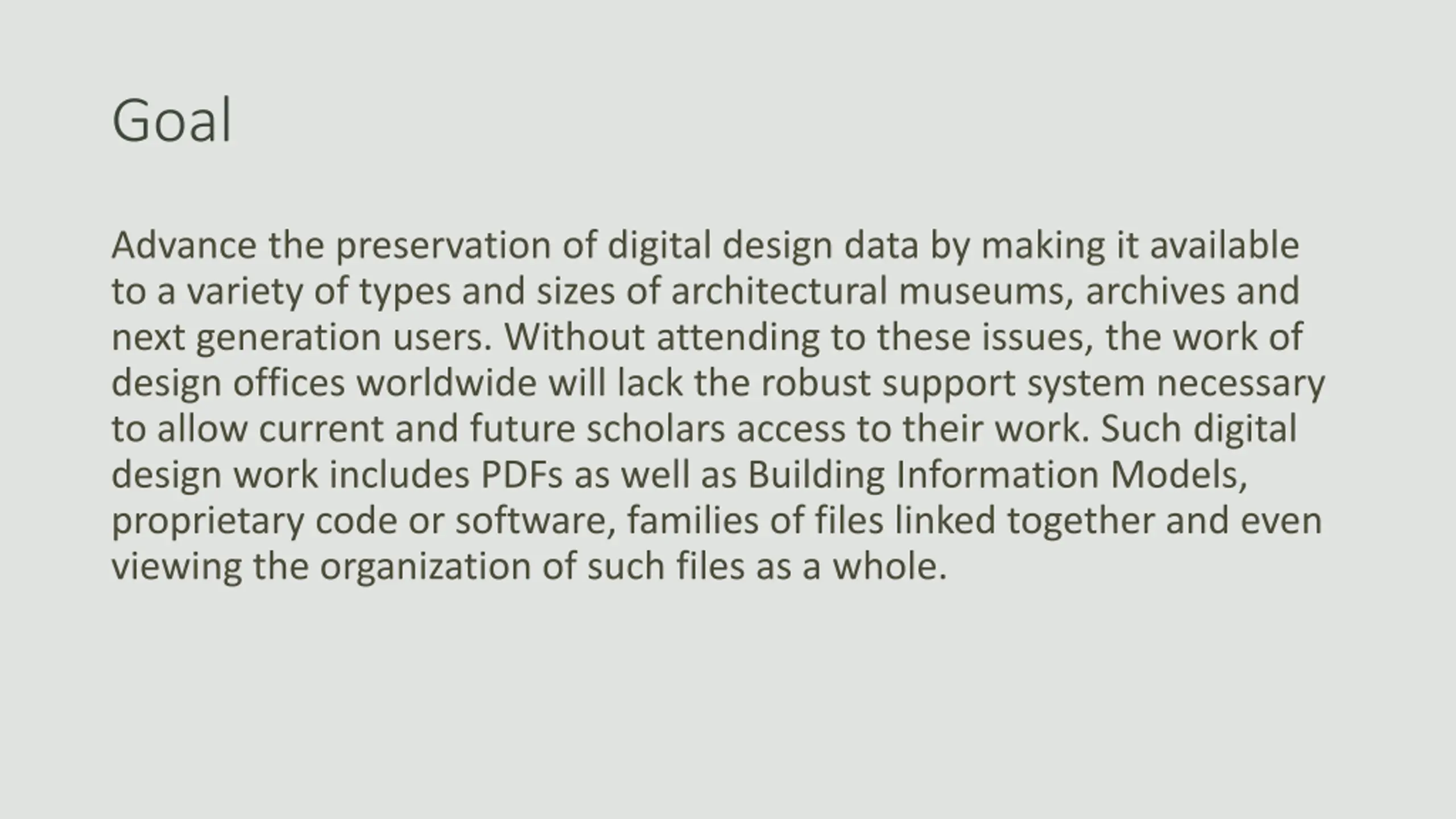 Goal Advance the preservation of digital design data by making it available to a variety of types and sizes of architectural museums, archives and next generation users. Without attending to these issues, the work of design offices worldwide will lack the robust support system necessary to allow current and future scholars access to their work. Such digital design work includes PDFs as well as Building Information Models, proprietary code or software, families of files linked together and even viewing the organization of such files as a whole.