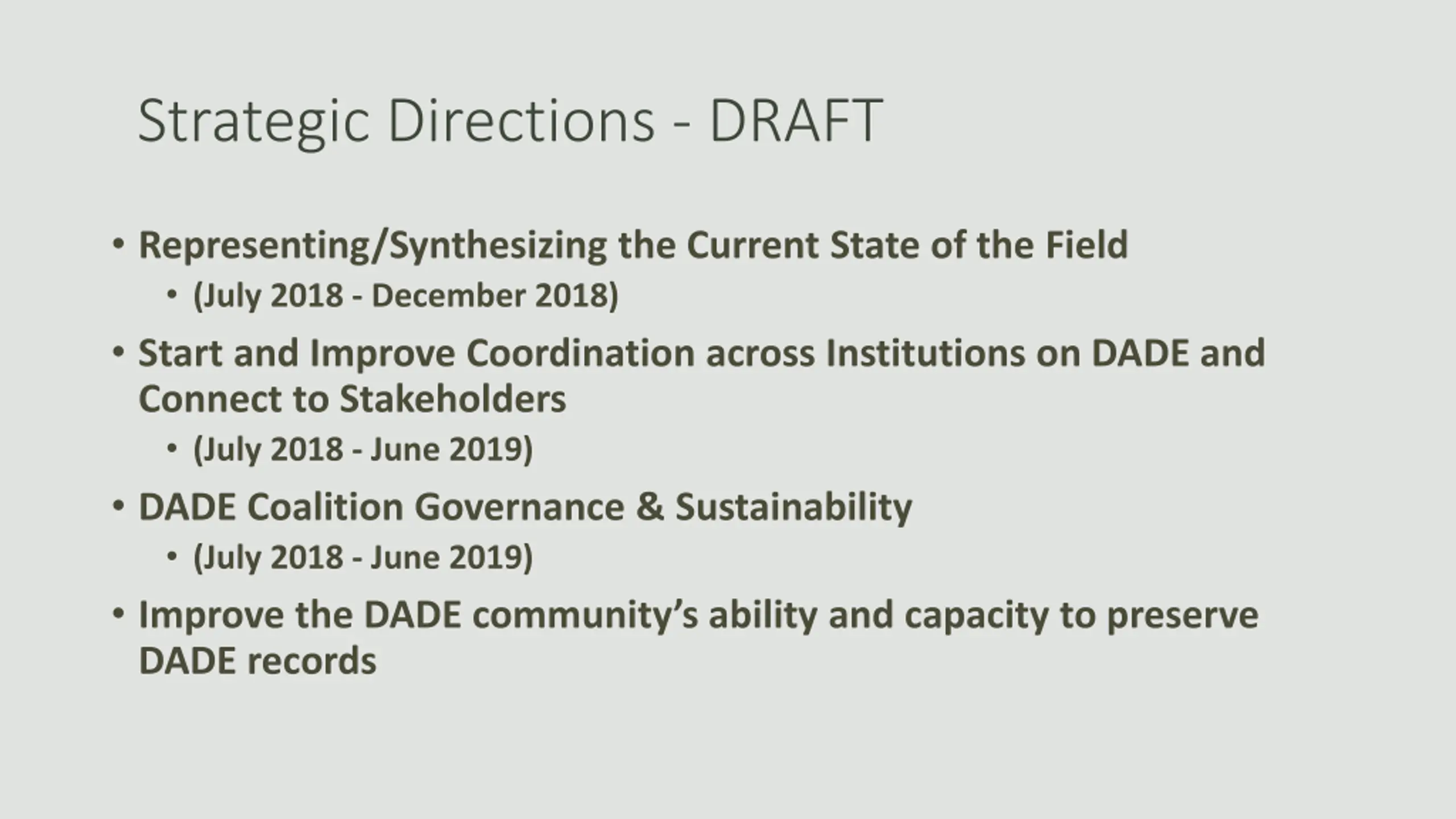 Strategic Directions - DRAFT Representing/Synthesizing the Current State of the Field (July 2018 - December 2018) Start and Improve Coordination across Institutions on DADE and Connect to Stakeholders (July 2018 - June 2019) DADE Coalition Governance & Sustainability (July 2018 - June 2019) Improve the DADE community s ability and capacity to preserve DADE records