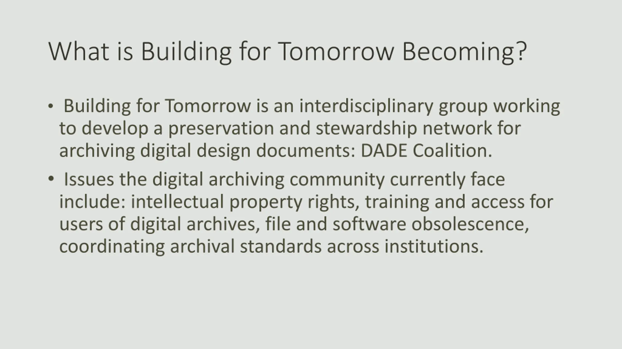 What is Building for Tomorrow Becoming? Building for Tomorrow is an interdisciplinary group working to develop a preservation and stewardship network for archiving digital design documents: DADE Coalition. Issues the digital archiving community currently face include: intellectual property rights, training and access for users of digital archives, file and software obsolescence, coordinating archival standards across institutions.