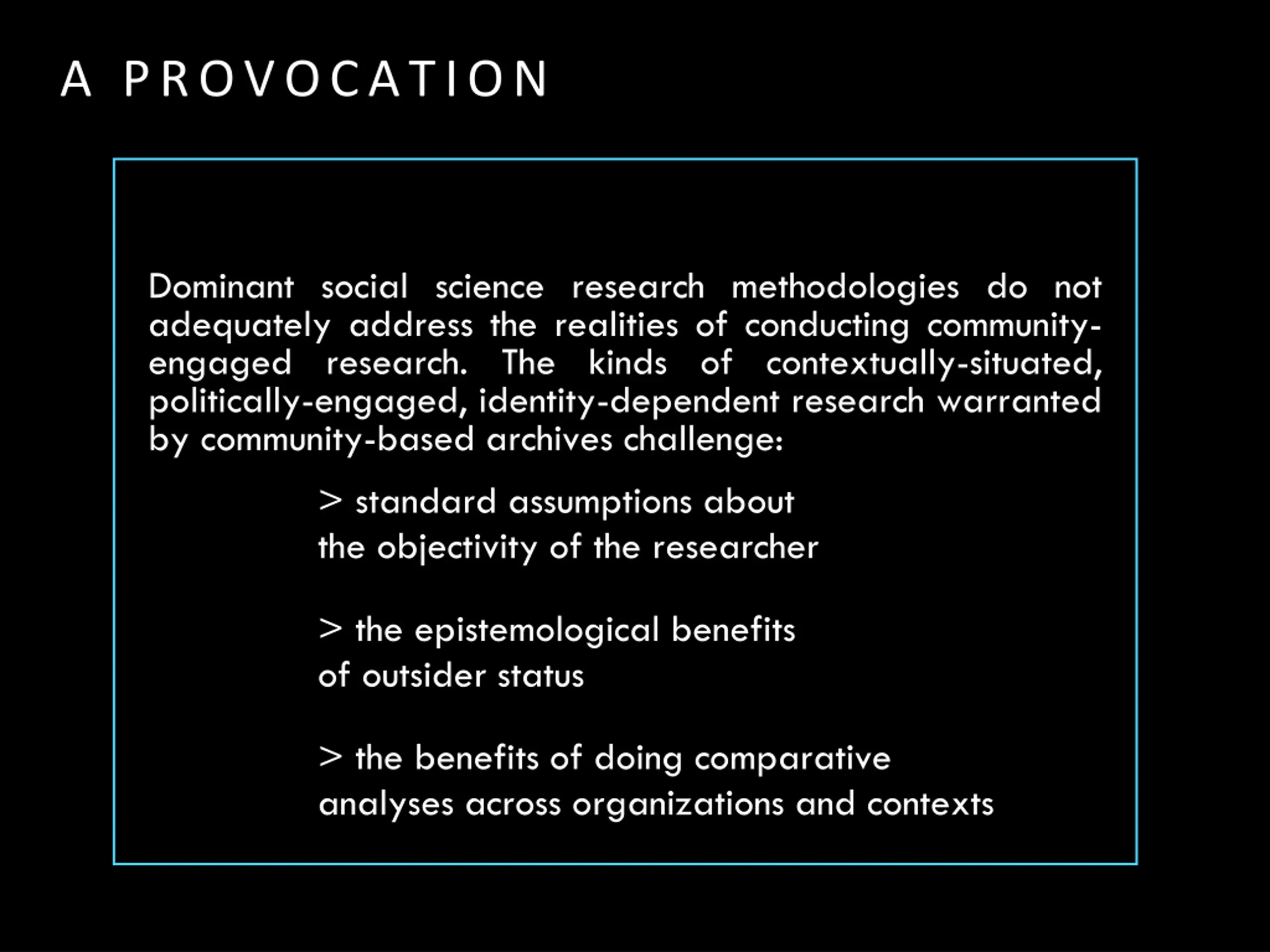 A PROVOCATION Dominant social science research methodologies do not adequately address the realities of conducting community- engaged research. The kinds of contextually-situated, politically-engaged, identity-dependent research warranted by community-based archives challenge: > standard assumptions about the objectivity of the researcher > the epistemological benefits of outsider status > the benefits of doing comparative analyses across organizations and contexts