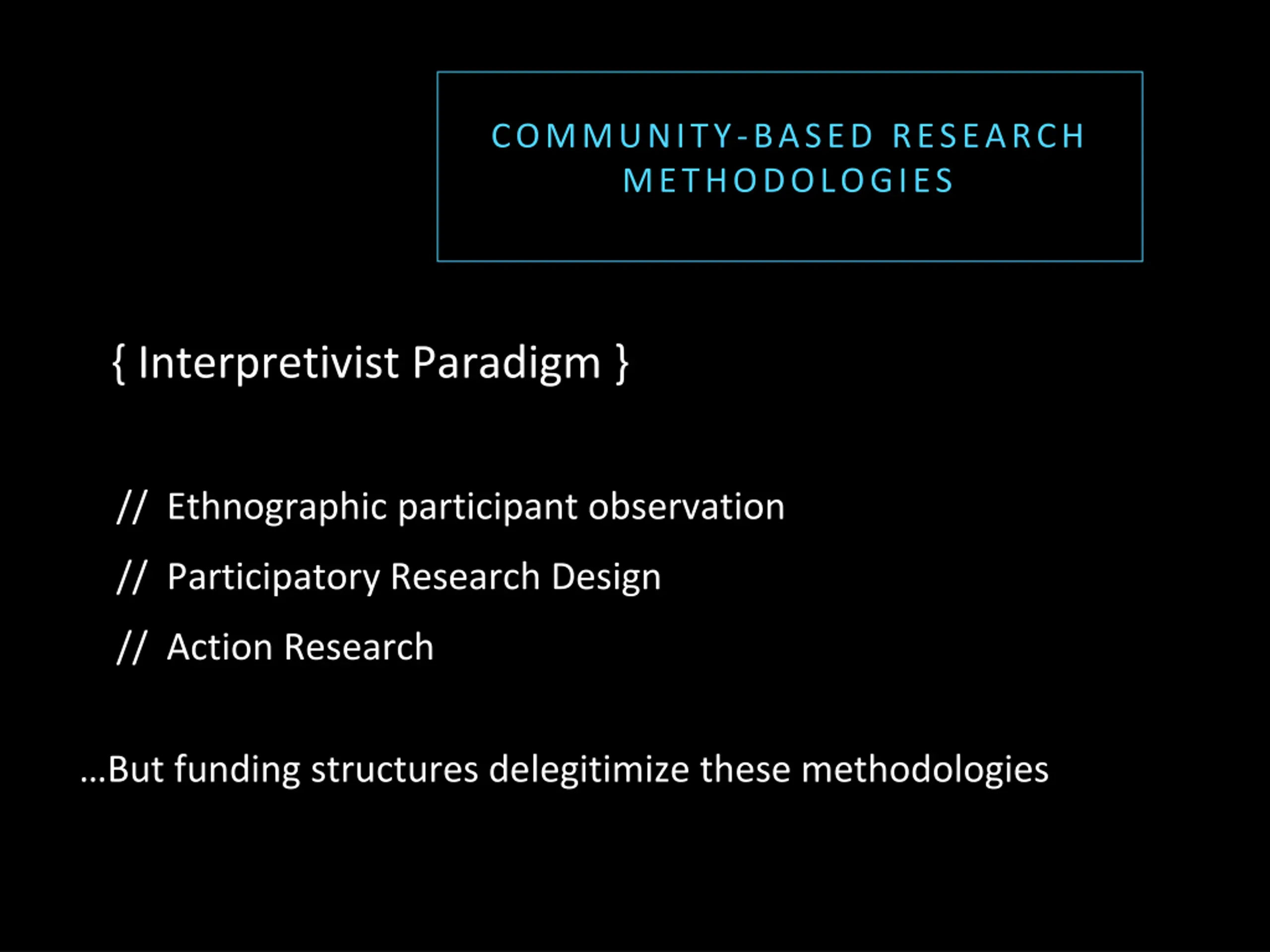 COMMUNITY-BASED RESEARCH METHODOLOGIES { Interpretivist Paradigm } // Ethnographic participant observation // Participatory Research Design // Action Research But funding structures delegitimize these methodologies