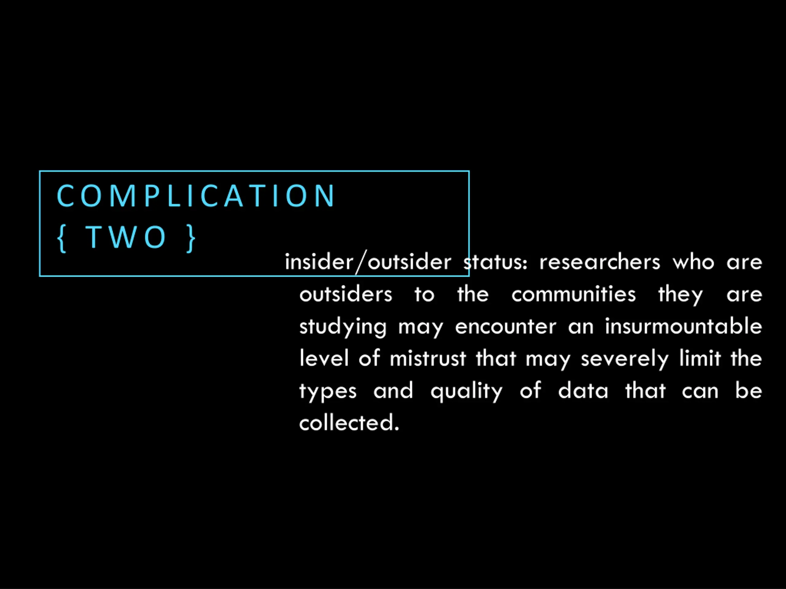 COMPLICATION { TWO } insider/outsider status: researchers who are outsiders to the communities they are studying may encounter an insurmountable level of mistrust that may severely limit the types and quality of data that can be collected.
