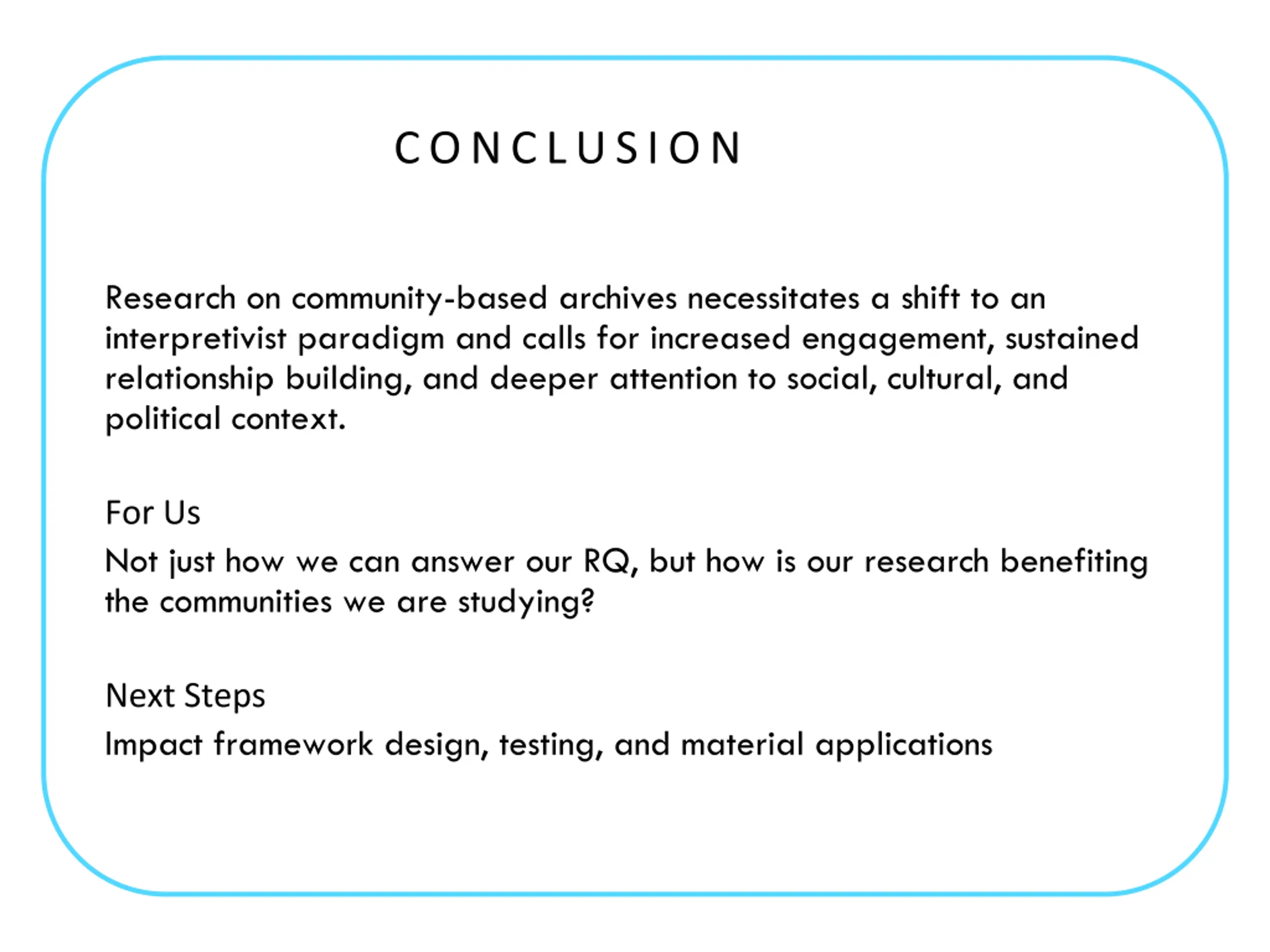 CONCLUSION Research on community-based archives necessitates a shift to an interpretivist paradigm and calls for increased engagement, sustained relationship building, and deeper attention to social, cultural, and political context. For Us Not just how we can answer our RQ, but how is our research benefiting the communities we are studying? Next Steps Impact framework design, testing, and material applications