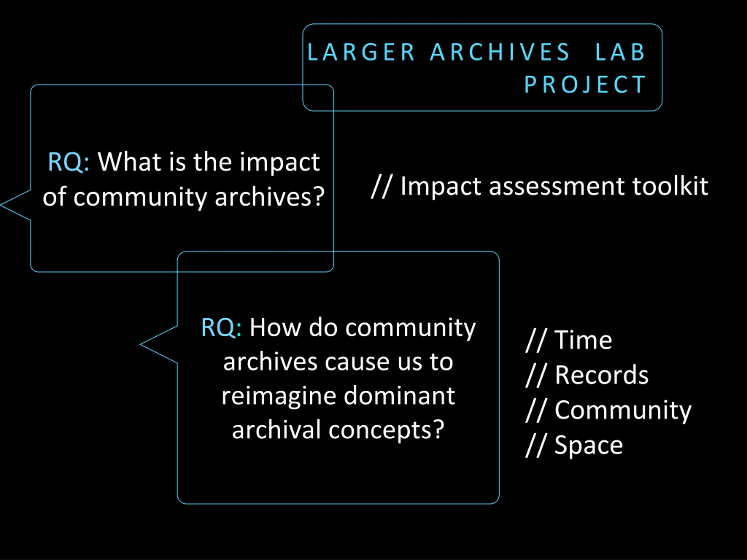 LARGER ARCHIVES LAB PROJECT RQ: What is the impact of community archives? // Impact assessment toolkit RQ: How do community archives cause us to reimagine dominant archival concepts? // Time // Records // Community // Space