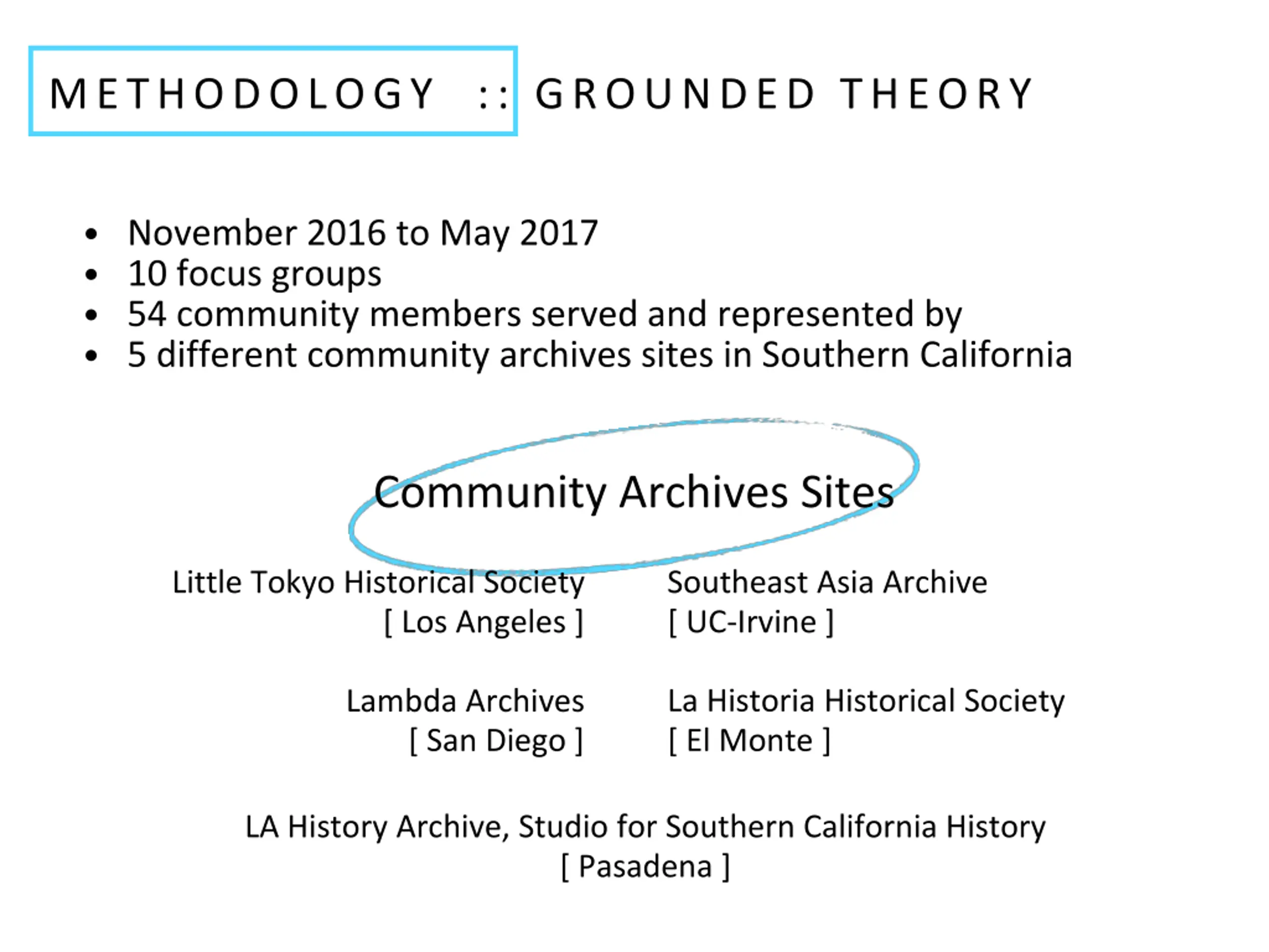 METHODOLOGY :: GROUNDED THEORY November 2016 to May 2017 10 focus groups 54 community members served and represented by 5 different community archives sites in Southern California Community Archives Sites Southeast Asia Archive [ UC-Irvine ] Little Tokyo Historical Society [ Los Angeles ] La Historia Historical Society [ El Monte ] Lambda Archives [ San Diego ] LA History Archive, Studio for Southern California History [ Pasadena ]