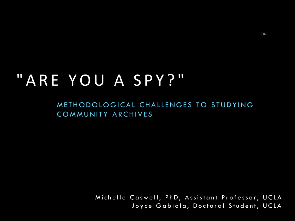 hi. "ARE YOU A SPY?" METHODOLOGICAL CHALLENGES TO STUDYING COMMUNITY ARCHIVES Michelle Caswell, PhD, Assistant Professor, UCLA Joyce Gabiola, Doctoral Student, UCLA