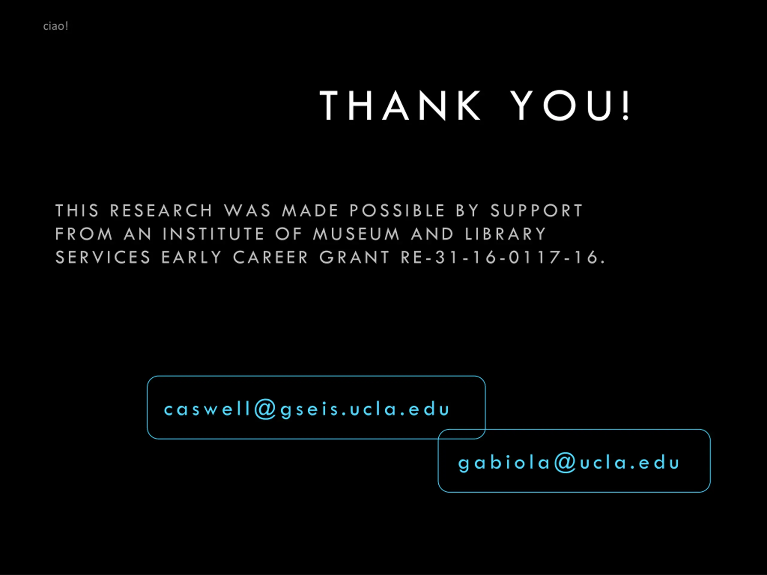 ciao! THANK YOU! THIS RESEARCH WAS MADE POSSIBLE BY SUPPORT FROM AN INSTITUTE OF MUSEUM AND LIBRARY SERVICES EARLY CAREER GRANT RE-31-16-0117-16. caswell@gseis.ucla.edu gabiola@ucla.edu