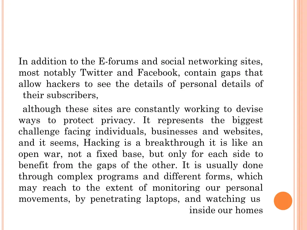 In addition to the E-forums and social networking sites, most notably Twitter and Facebook, contain gaps that allow hackers to see the details of personal details of their subscribers, although these sites are constantly working to devise ways to protect privacy. It represents the biggest challenge facing individuals, businesses and websites, and it seems, Hacking is a breakthrough it is like an open war, not a fixed base, but only for each side to benefit from the gaps of the other. It is usually done through complex programs and different forms, which may reach to the extent of monitoring our personal movements, by penetrating laptops, and watching us inside our homes