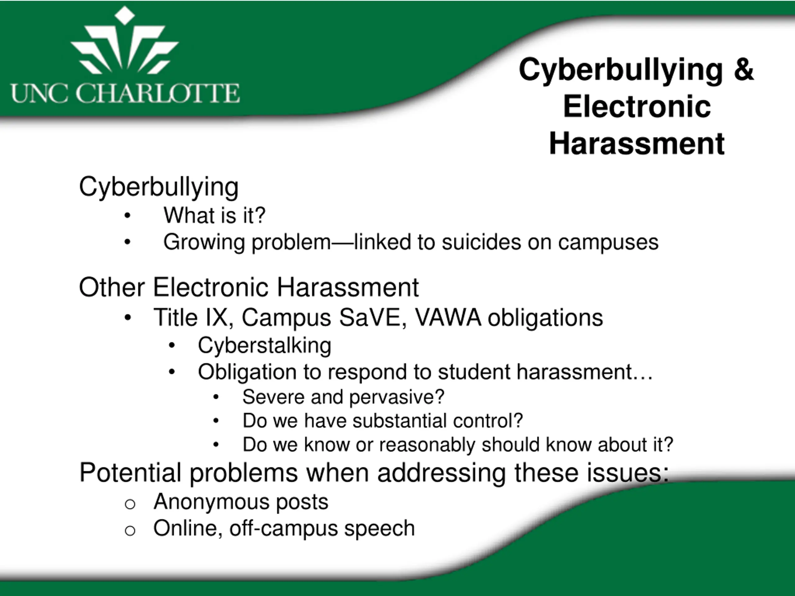 Cyberbullying & Electronic Harassment Cyberbullying What is it? Growing problem linked to suicides on campuses Other Electronic Harassment Title IX, Campus SaVE, VAWA obligations Cyberstalking Obligation to respond to student harassment Severe and pervasive? Do we have substantial control? Do we know or reasonably should know about it? Potential problems when addressing these issues: o Anonymous posts o Online, off-campus speech