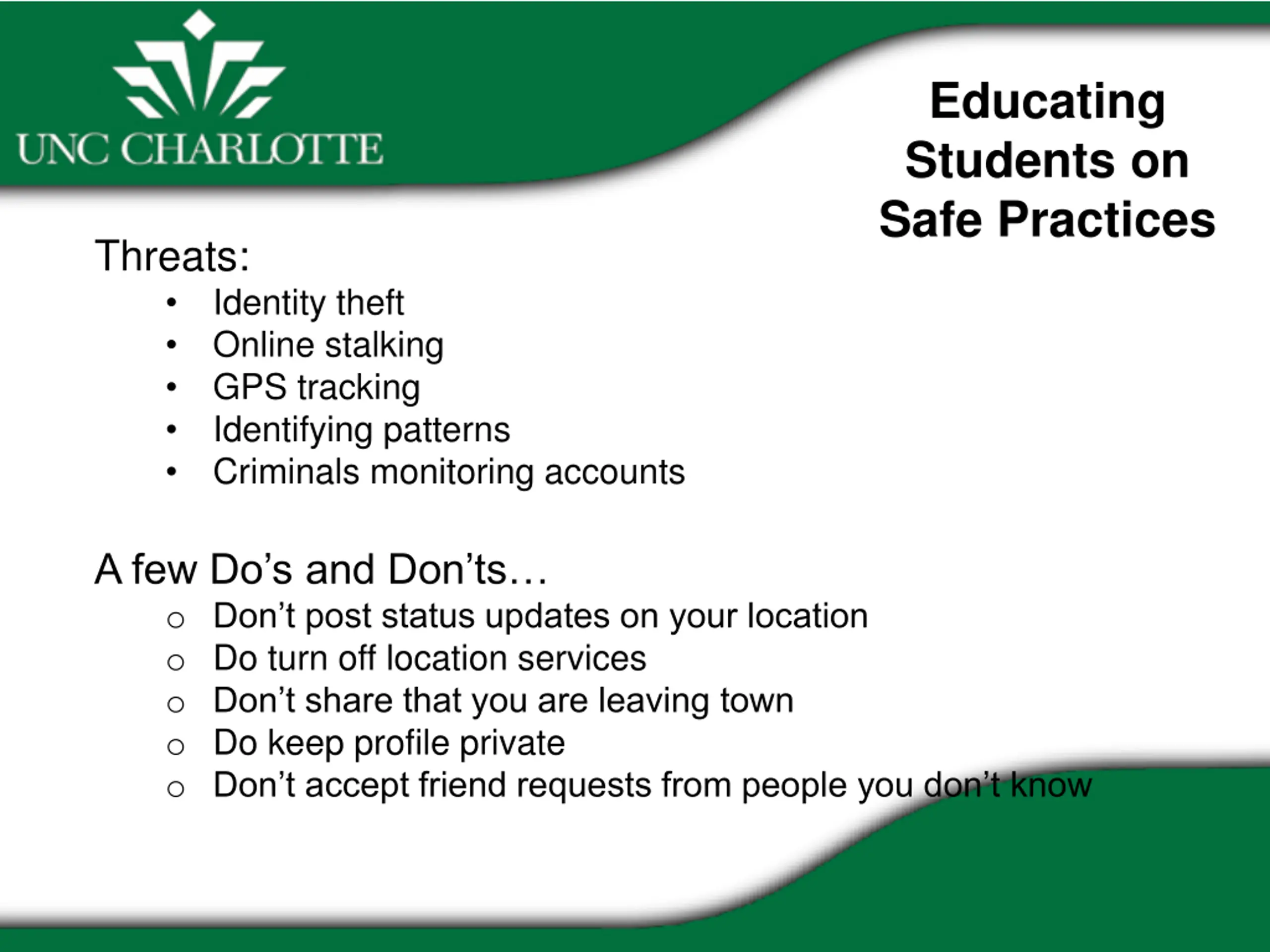 Educating Students on Safe Practices Threats: Identity theft Online stalking GPS tracking Identifying patterns Criminals monitoring accounts A few Do s and Don ts o Don t post status updates on your location o Do turn off location services o Don t share that you are leaving town o Do keep profile private o Don t accept friend requests from people you don t know
