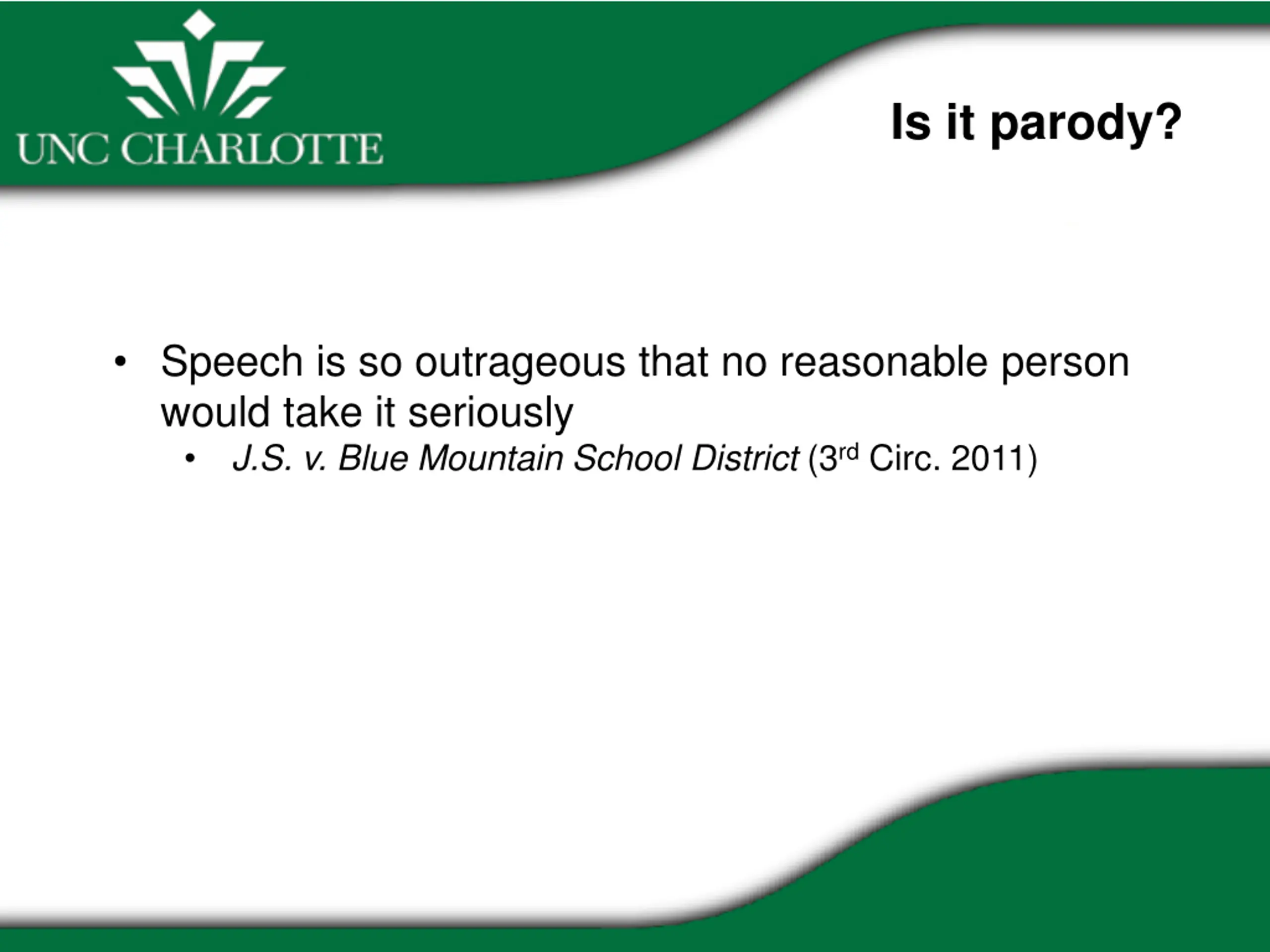 Is it parody? Speech is so outrageous that no reasonable person would take it seriously J.S. v. Blue Mountain School District (3rd Circ. 2011)
