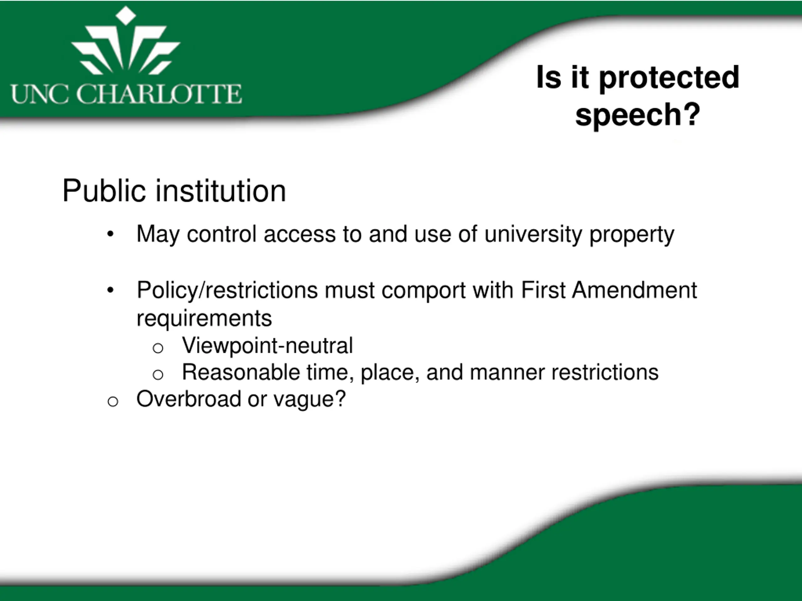 Is it protected speech? Public institution May control access to and use of university property Policy/restrictions must comport with First Amendment requirements o Viewpoint-neutral o Reasonable time, place, and manner restrictions o Overbroad or vague?
