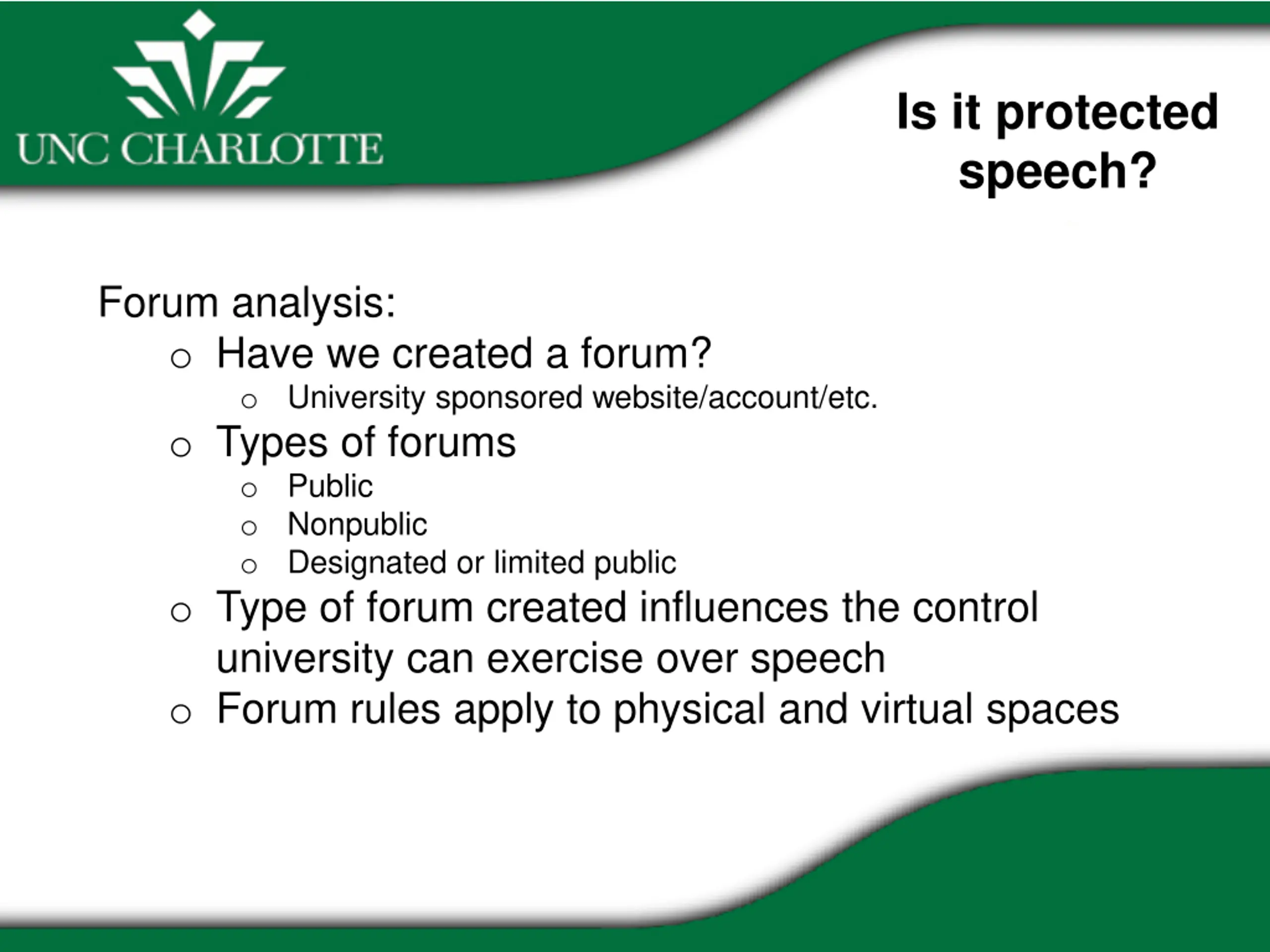 Is it protected speech? Forum analysis: o Have we created a forum? o University sponsored website/account/etc. o Types of forums o Public o Nonpublic o Designated or limited public o Type of forum created influences the control university can exercise over speech o Forum rules apply to physical and virtual spaces