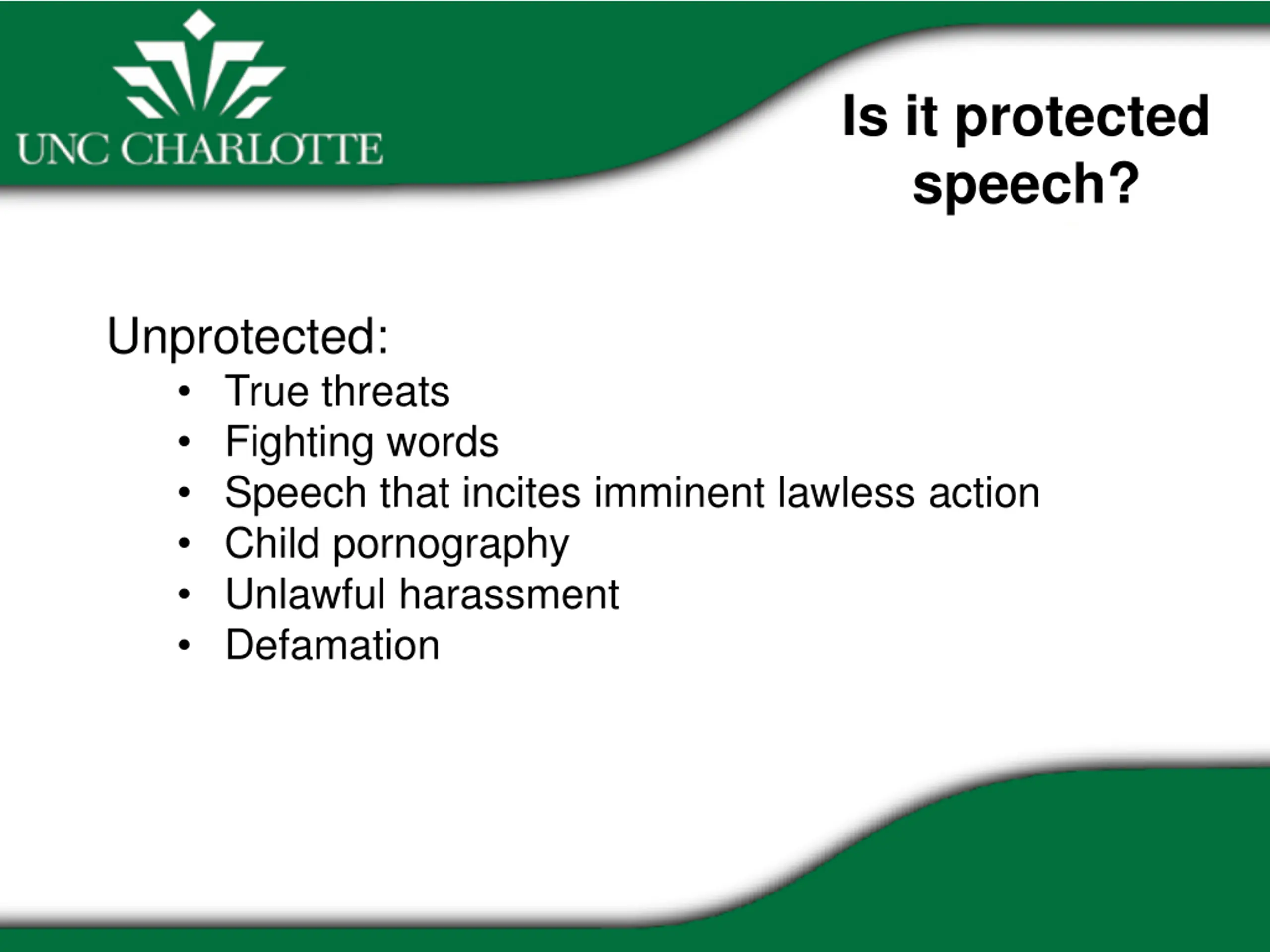 Is it protected speech? Unprotected: True threats Fighting words Speech that incites imminent lawless action Child pornography Unlawful harassment Defamation
