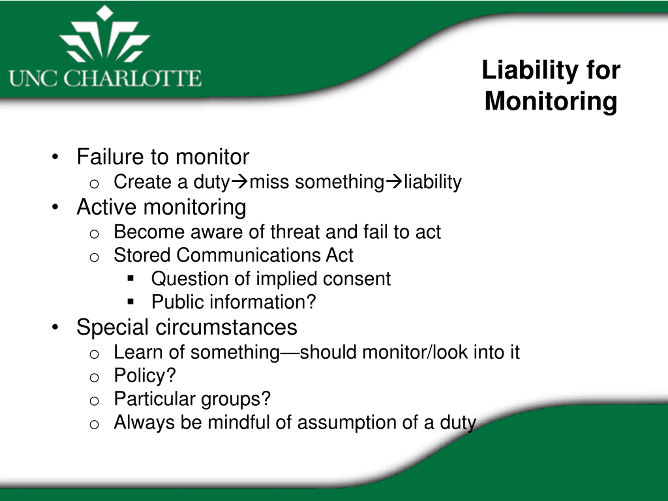 Liability for Monitoring Failure to monitor o Create a duty miss something liability Active monitoring o Become aware of threat and fail to act o Stored Communications Act Question of implied consent Public information? Special circumstances o Learn of something should monitor/look into it o Policy? o Particular groups? o Always be mindful of assumption of a duty