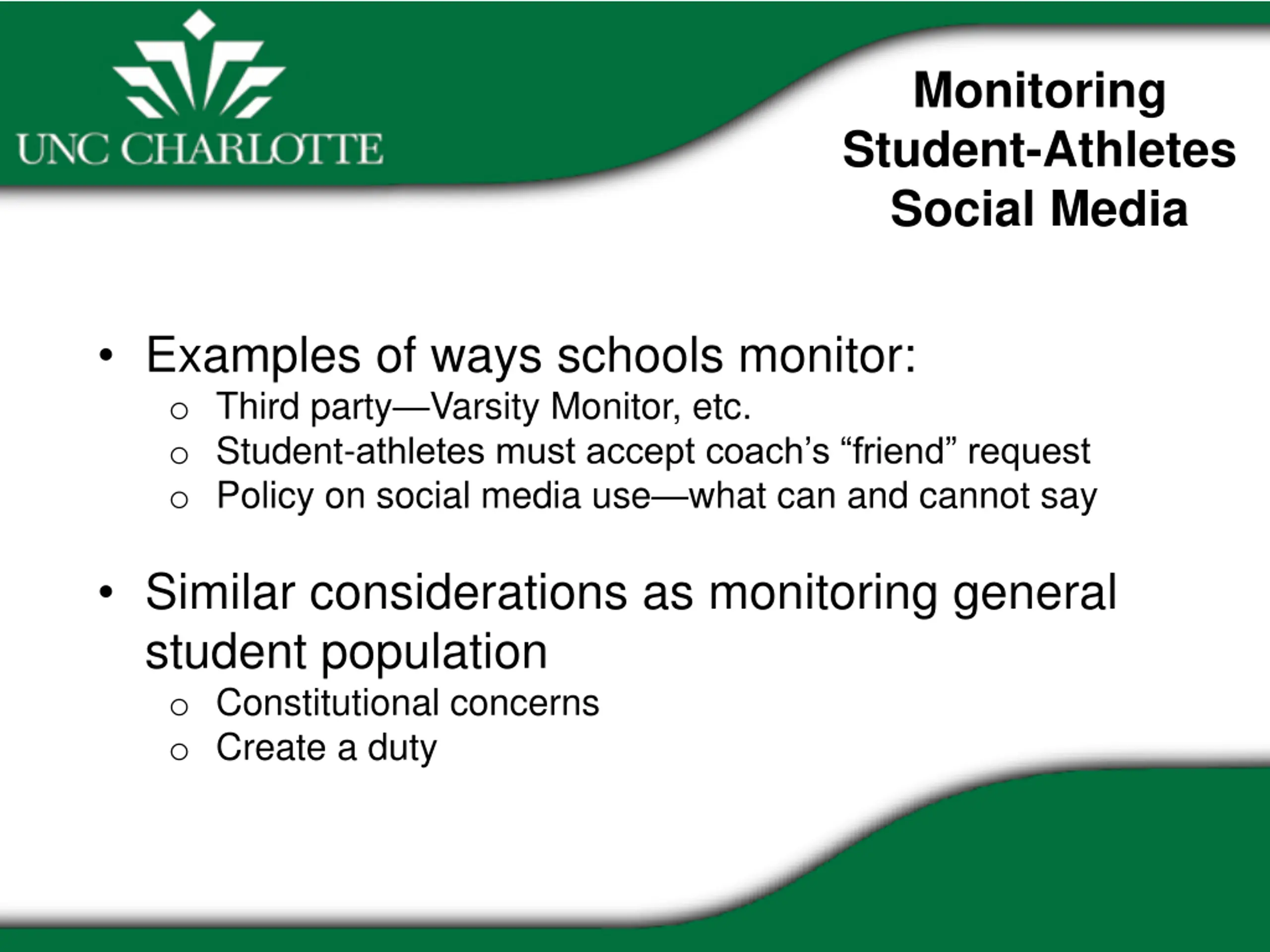 Monitoring Student-Athletes Social Media Examples of ways schools monitor: o Third party Varsity Monitor, etc. o Student-athletes must accept coach s friend request o Policy on social media use what can and cannot say Similar considerations as monitoring general student population o Constitutional concerns o Create a duty