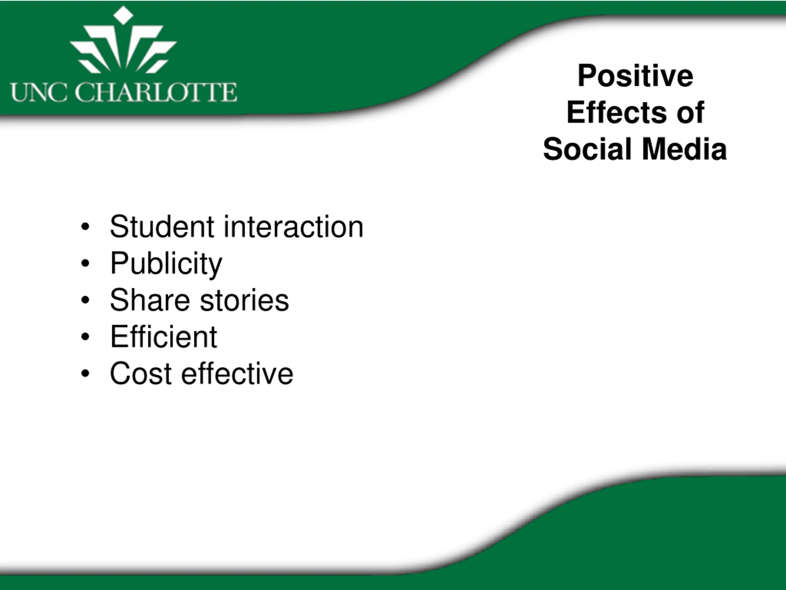 Positive Effects of Social Media Student interaction Publicity Share stories Efficient Cost effective