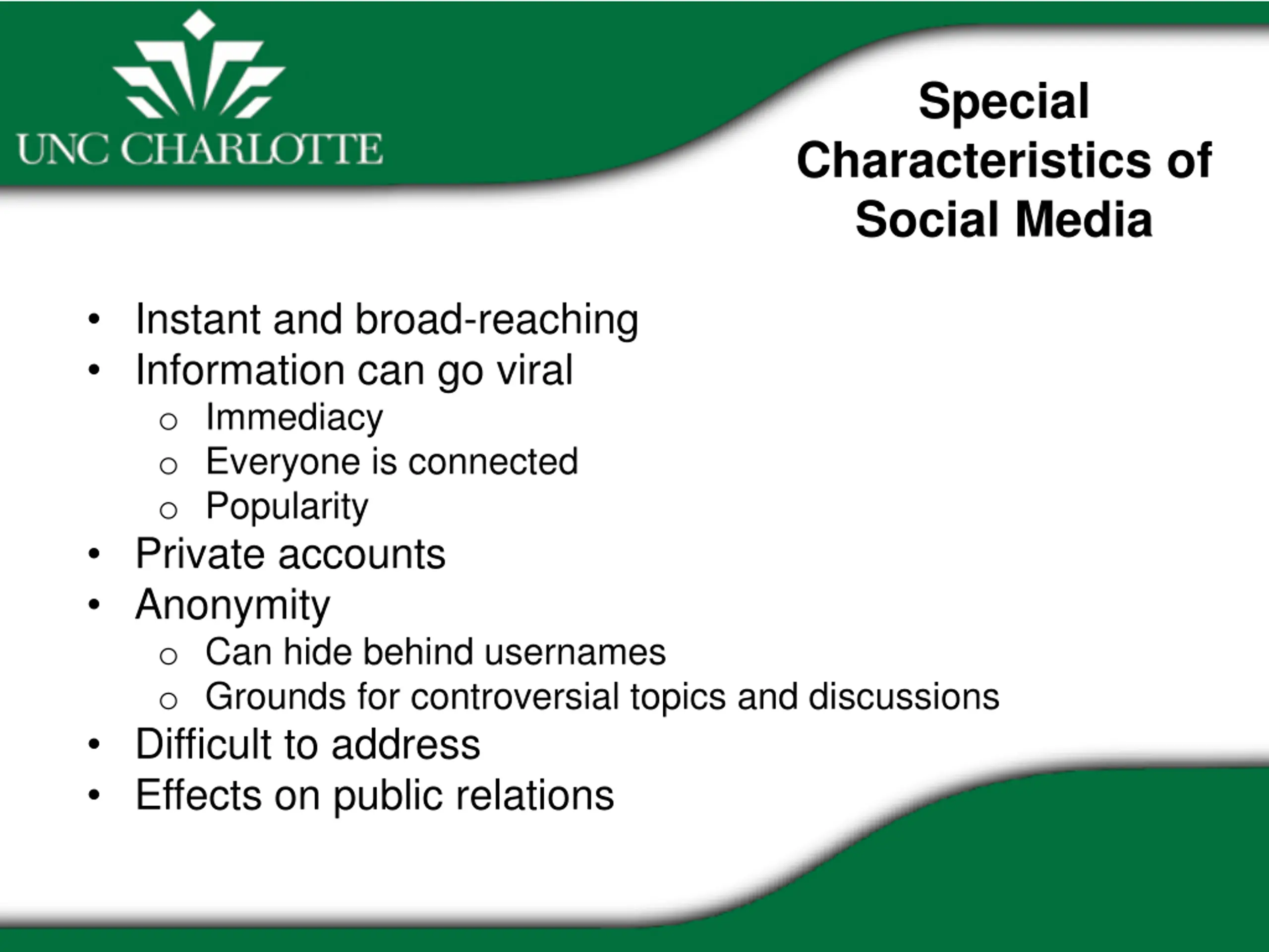 Special Characteristics of Social Media Instant and broad-reaching Information can go viral o Immediacy o Everyone is connected o Popularity Private accounts Anonymity o Can hide behind usernames o Grounds for controversial topics and discussions Difficult to address Effects on public relations