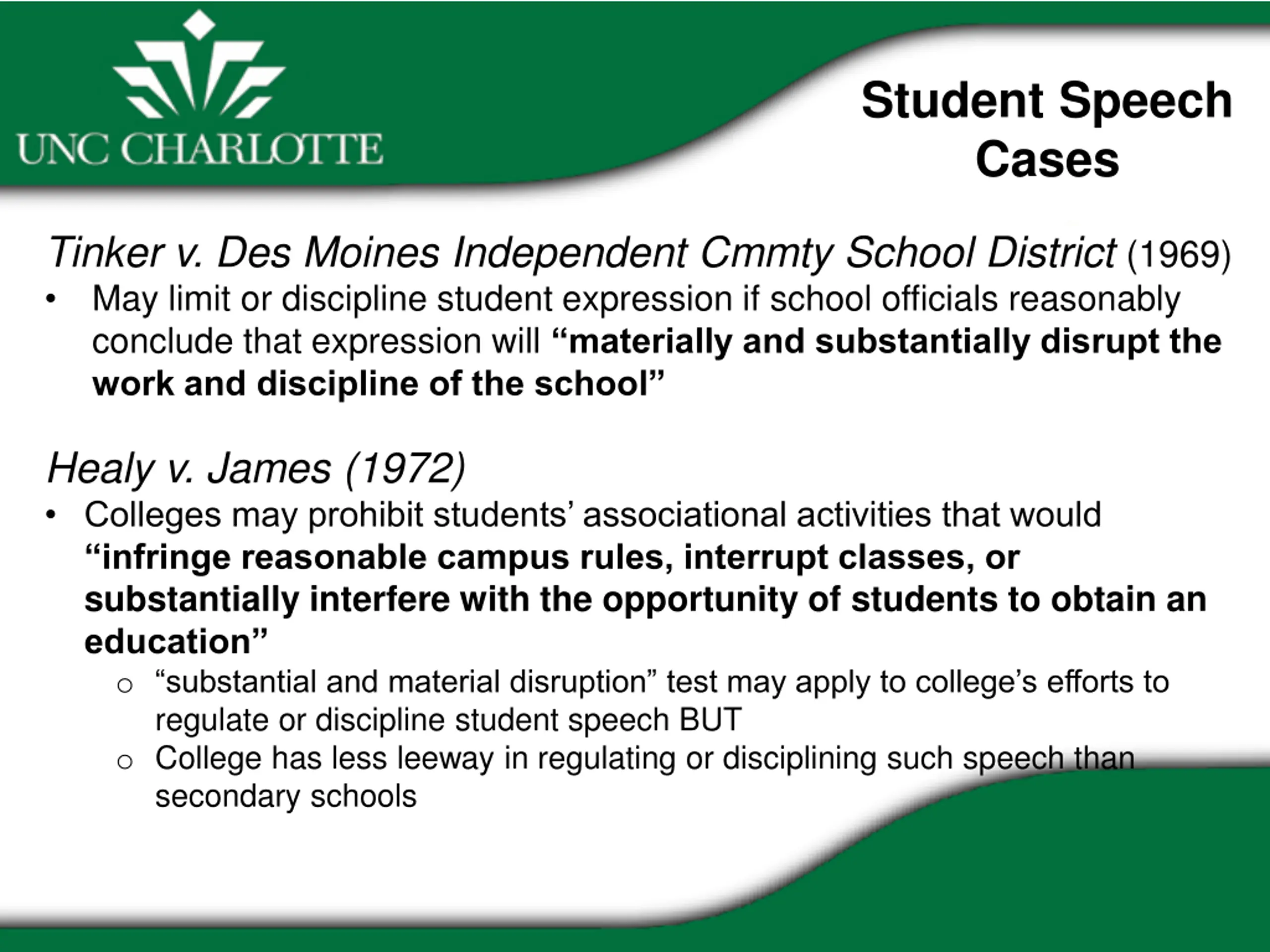 Student Speech Cases Tinker v. Des Moines Independent Cmmty School District (1969) May limit or discipline student expression if school officials reasonably conclude that expression will materially and substantially disrupt the work and discipline of the school Healy v. James (1972) Colleges may prohibit students associational activities that would infringe reasonable campus rules, interrupt classes, or substantially interfere with the opportunity of students to obtain an education o substantial and material disruption test may apply to college s efforts to regulate or discipline student speech BUT o College has less leeway in regulating or disciplining such speech than secondary schools