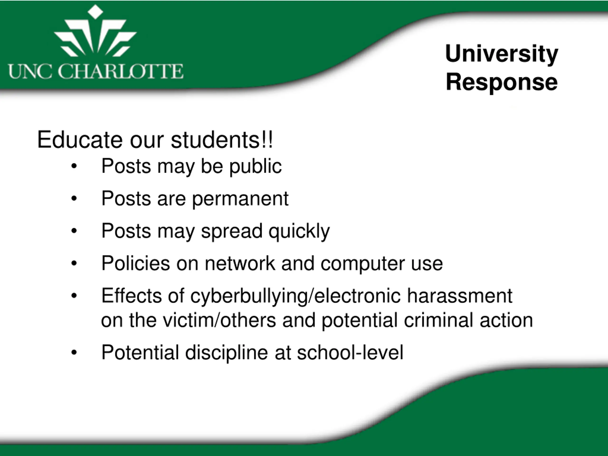 University Response Educate our students!! Posts may be public Posts are permanent Posts may spread quickly Policies on network and computer use Effects of cyberbullying/electronic harassment on the victim/others and potential criminal action Potential discipline at school-level