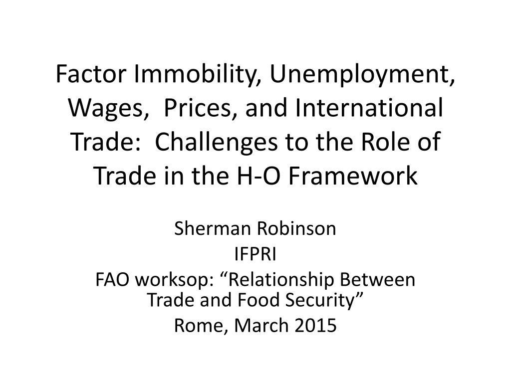 Factor Immobility, Unemployment, Wages, Prices, and International Trade: Challenges to the Role of Trade in the H-O Framework Sherman Robinson IFPRI FAO worksop: Relationship Between Trade and Food Security Rome, March 2015