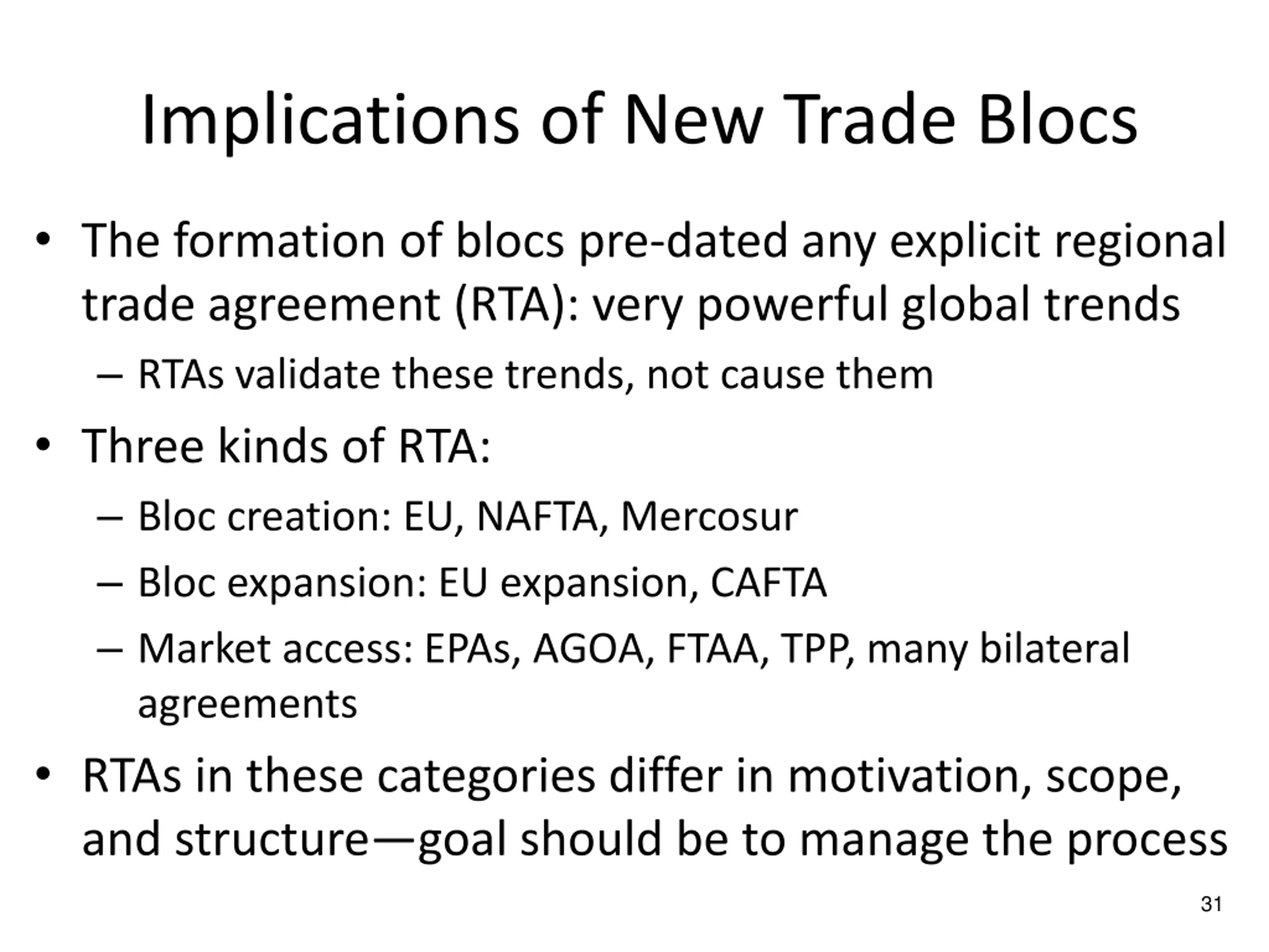 Implications of New Trade Blocs The formation of blocs pre-dated any explicit regional trade agreement (RTA): very powerful global trends RTAs validate these trends, not cause them Three kinds of RTA: Bloc creation: EU, NAFTA, Mercosur Bloc expansion: EU expansion, CAFTA Market access: EPAs, AGOA, FTAA, TPP, many bilateral agreements RTAs in these categories differ in motivation, scope, and structure goal should be to manage the process 31