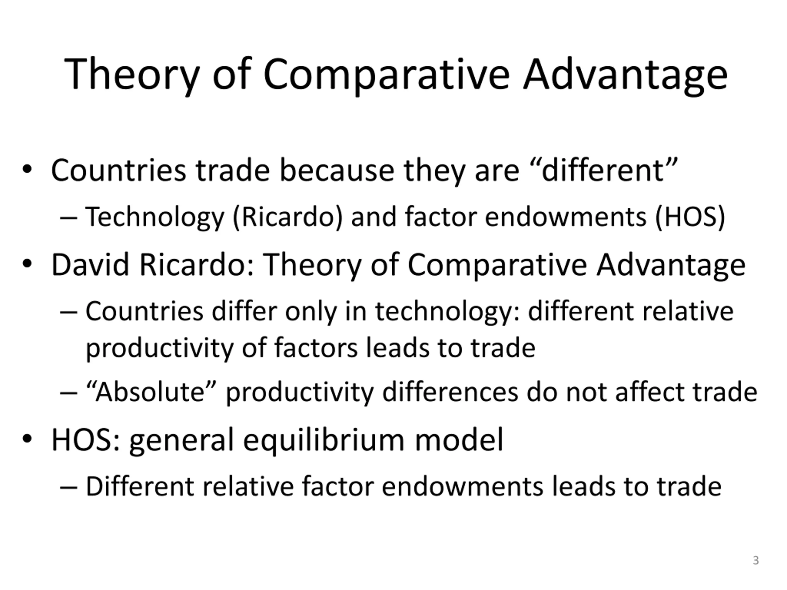 Benefits of International Trade Theory of comparative advantage Necessary and sufficient conditions to generate trade David Ricardo Heckscher-Ohlin-Samuelson (HOS) Major theorems: Trade and Wages Stolper-Samuelson Rybczynski Factor Price Equalization (Samuelson) 2