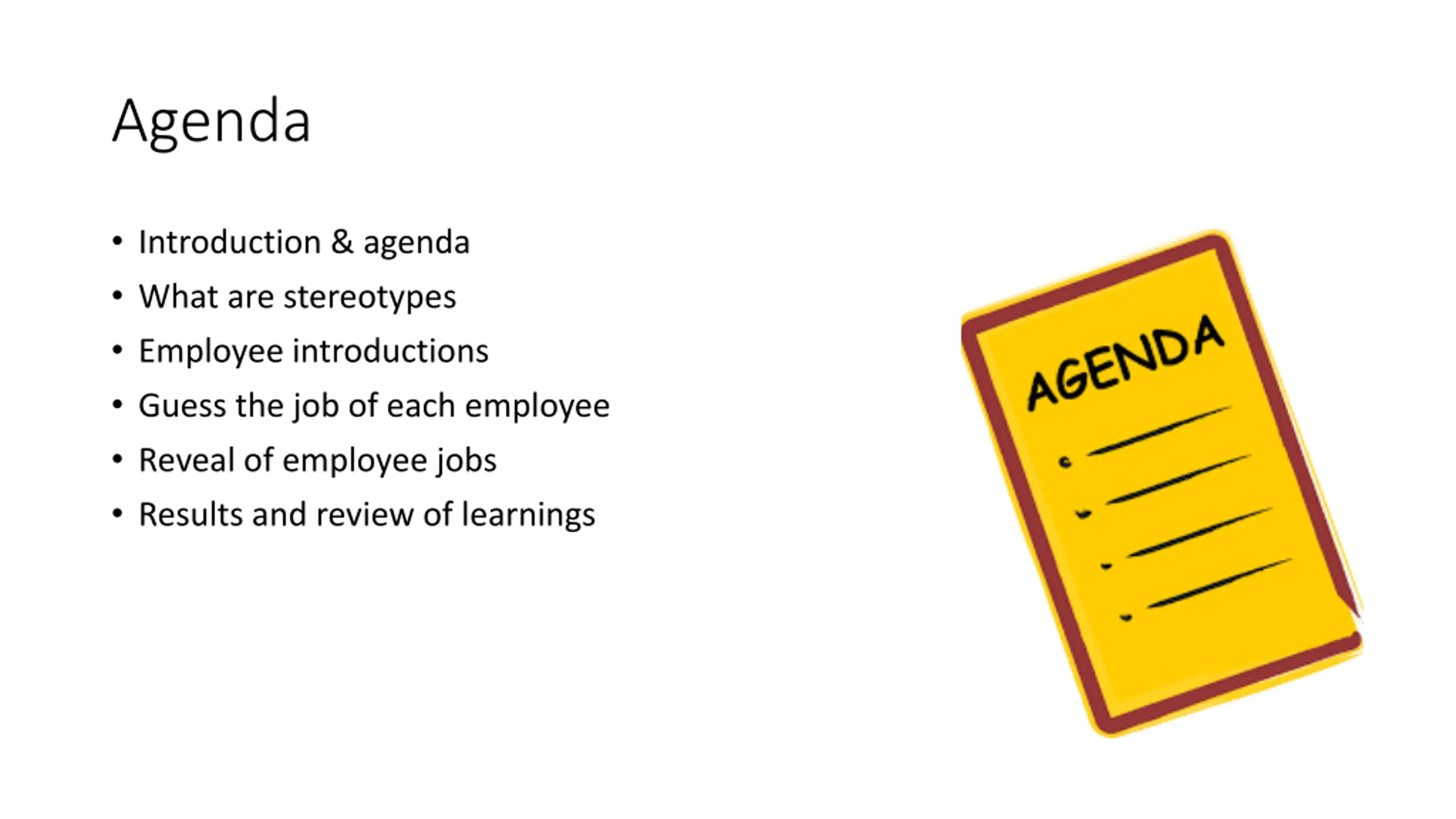 Agenda Introduction & agenda What are stereotypes Employee introductions Guess the job of each employee Reveal of employee jobs Results and review of learnings