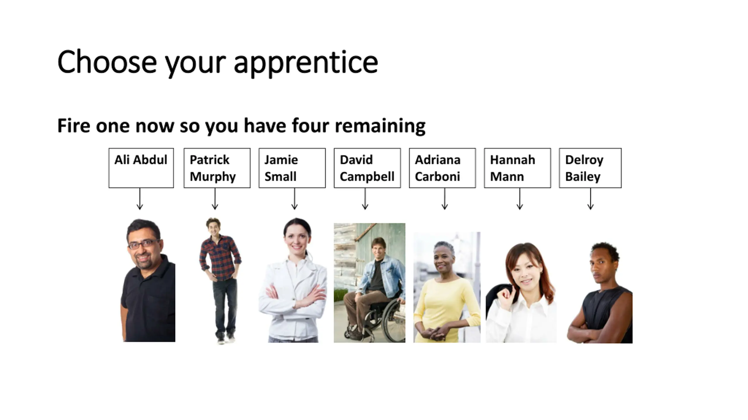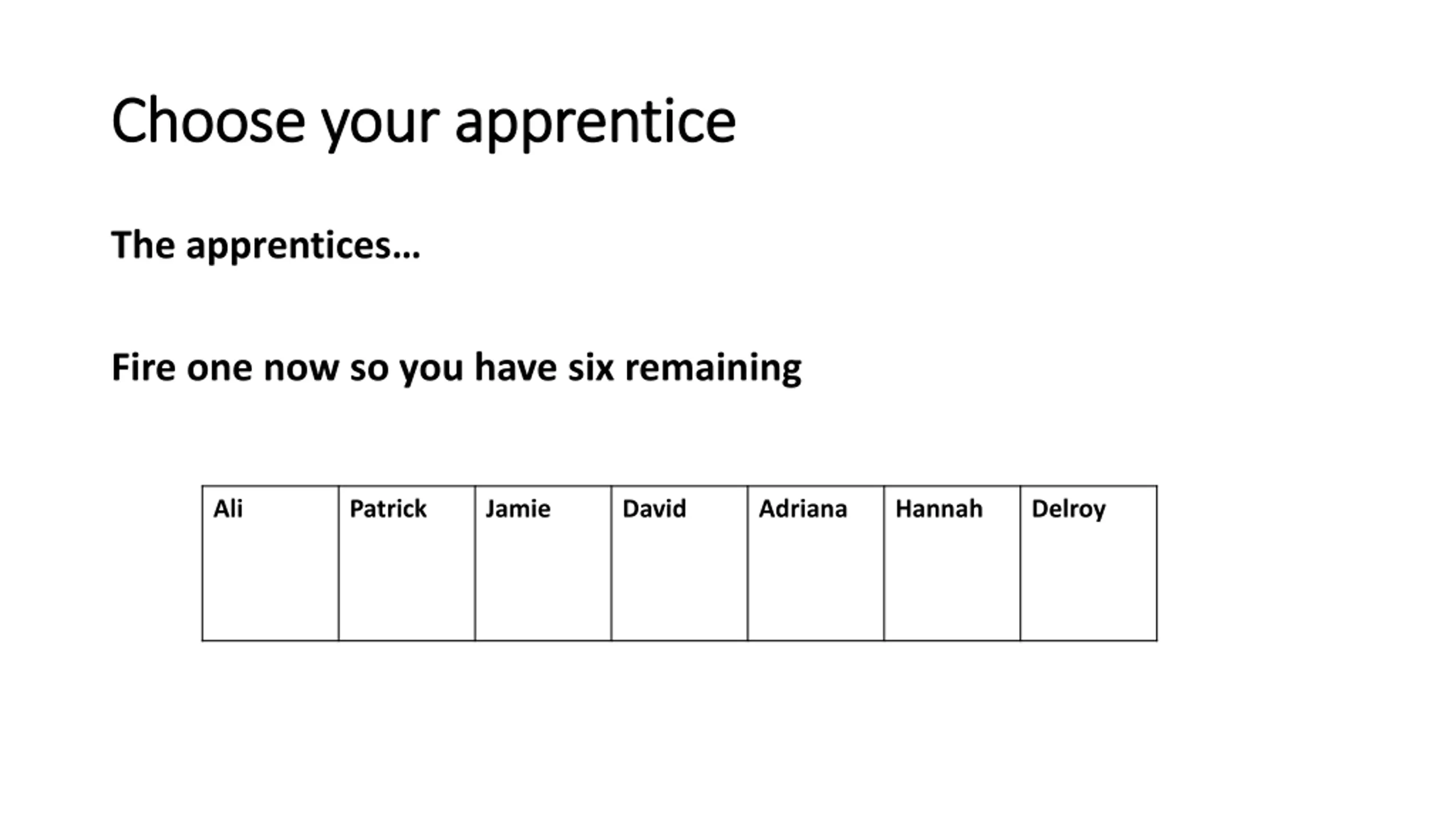 Choose your apprentice Choose your apprentice You have 7 applicants (write these names down): Ali Patrick Jamie David Adriana Hannah Delroy Each time I reveal a layer of information about each applicant, you need to fire one person by crossing out their name. Who will you fire and hire ?