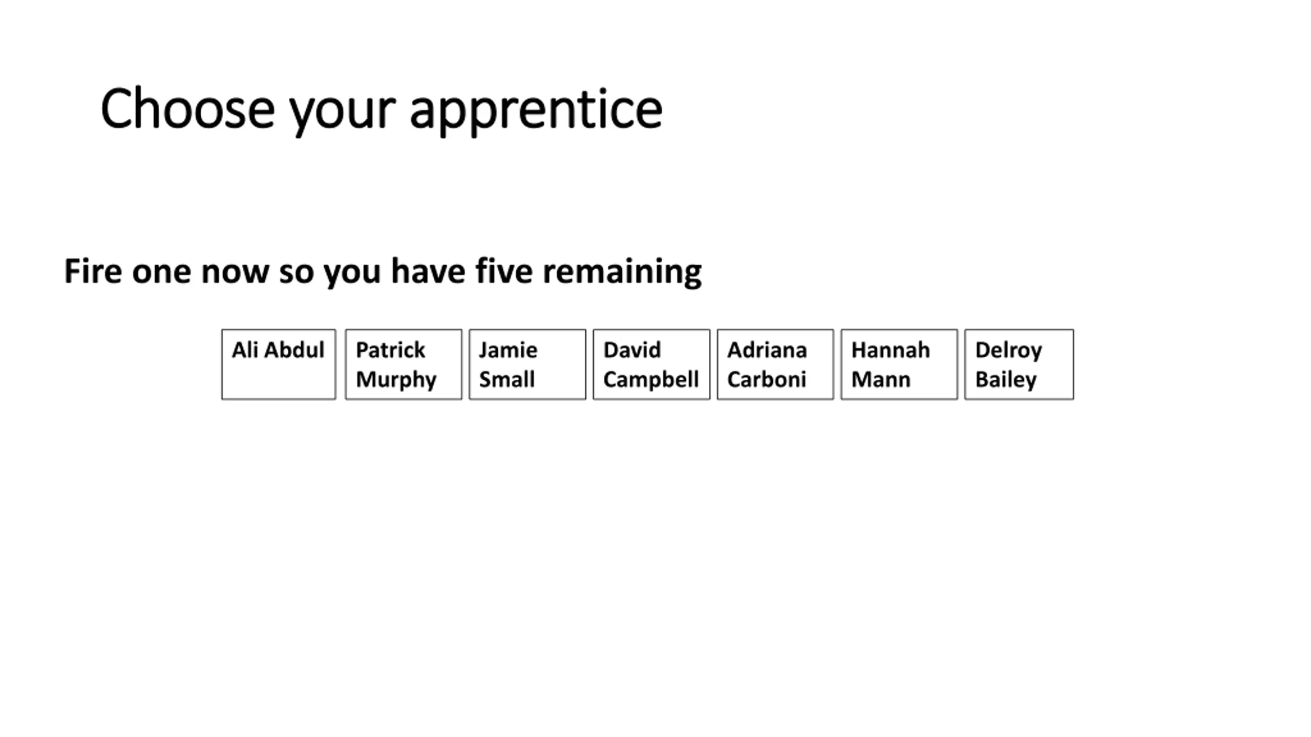 Choose your apprentice Choose your apprentice The apprentices Fire one now so you have six remaining Ali Patrick Jamie David Adriana Hannah Delroy