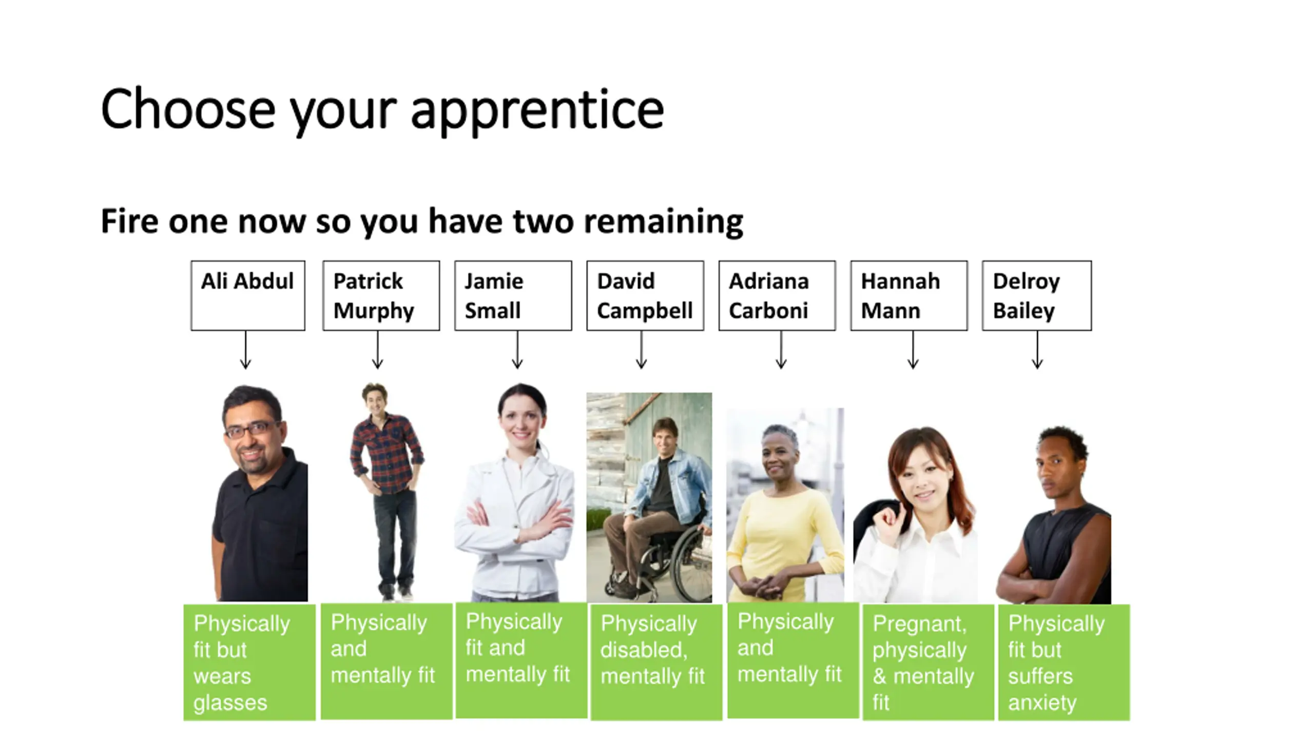 Choose your apprentice Choose your apprentice Fire one now so you have two remaining Ali Abdul Patrick Murphy Jamie Small David Campbell Adriana Carboni Hannah Mann Delroy Bailey Physically fit and mentally fit Physically and mentally fit Physically and mentally fit Physically fit but wears glasses Physically disabled, mentally fit Physically fit but suffers anxiety Pregnant, physically & mentally fit