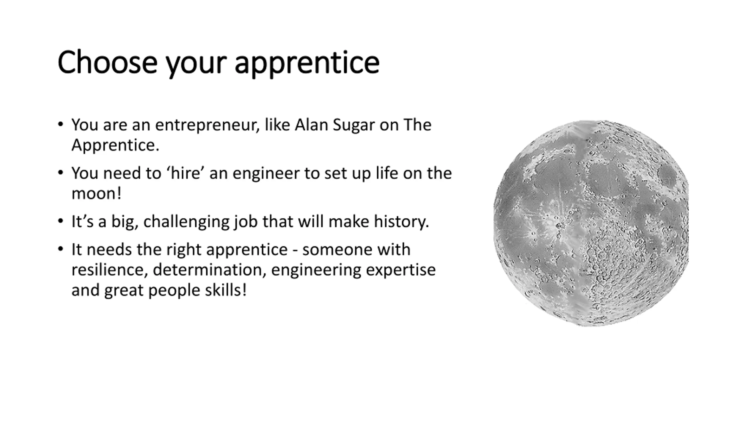 Choose your apprentice Choose your apprentice You are an entrepreneur, like Alan Sugar on The Apprentice. You need to hire an engineer to set up life on the moon! It s a big, challenging job that will make history. It needs the right apprentice - someone with resilience, determination, engineering expertise and great people skills!