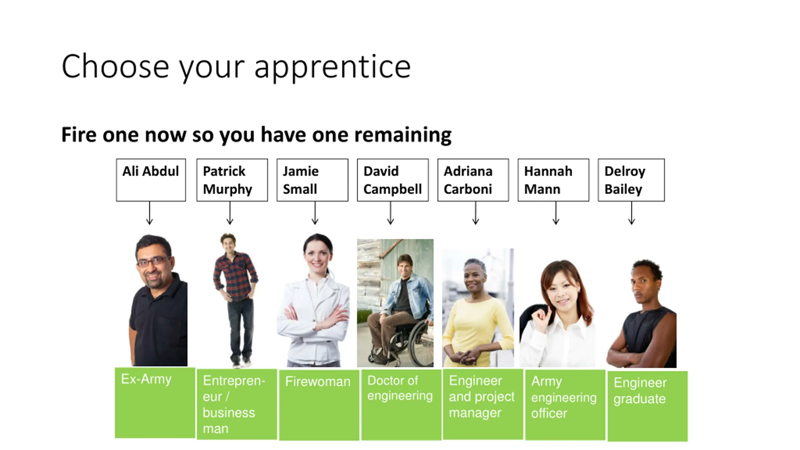 Choose your apprentice Fire one now so you have one remaining Ali Abdul Patrick Murphy Jamie Small David Campbell Adriana Carboni Hannah Mann Delroy Bailey Ex-Army Entrepren- eur / business man Engineer and project manager Doctor of engineering Army engineering officer Firewoman Engineer graduate