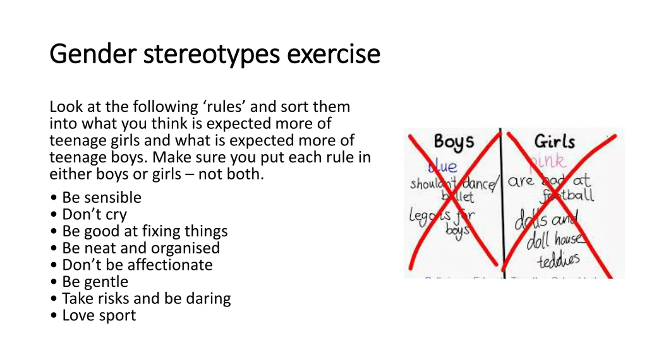 Gender stereotypes exercise Gender stereotypes exercise Look at the following rules and sort them into what you think is expected more of teenage girls and what is expected more of teenage boys. Make sure you put each rule in either boys or girls not both. Be sensible Don t cry Be good at fixing things Be neat and organised Don t be affectionate Be gentle Take risks and be daring Love sport