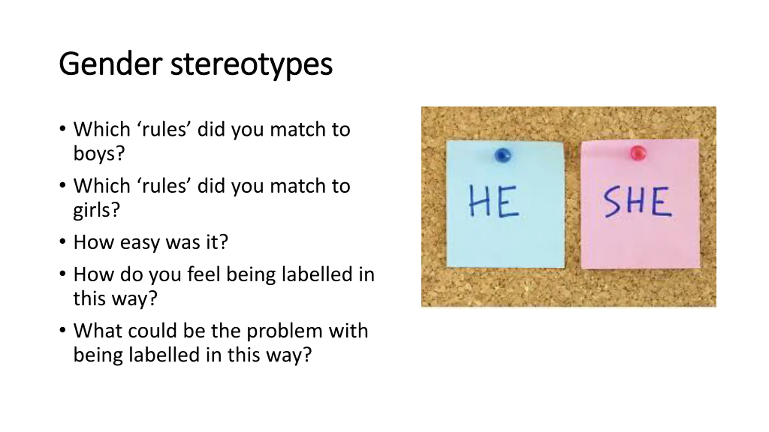 Gender stereotypes Gender stereotypes Which rules did you match to boys? Which rules did you match to girls? How easy was it? How do you feel being labelled in this way? What could be the problem with being labelled in this way?