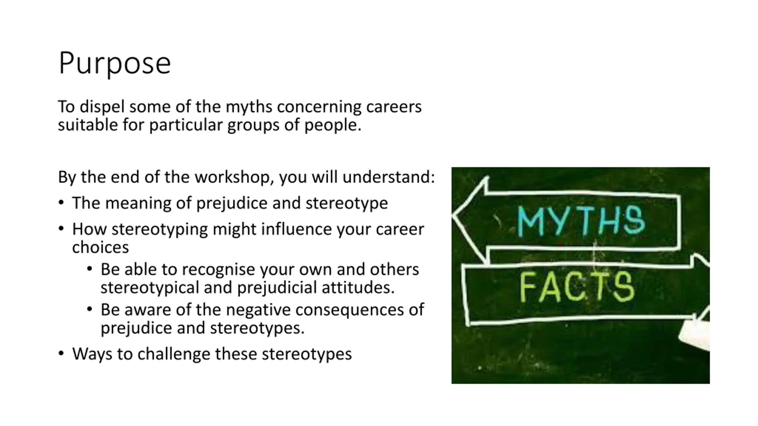 Purpose To dispel some of the myths concerning careers suitable for particular groups of people. By the end of the workshop, you will understand: The meaning of prejudice and stereotype How stereotyping might influence your career choices Be able to recognise your own and others stereotypical and prejudicial attitudes. Be aware of the negative consequences of prejudice and stereotypes. Ways to challenge these stereotypes