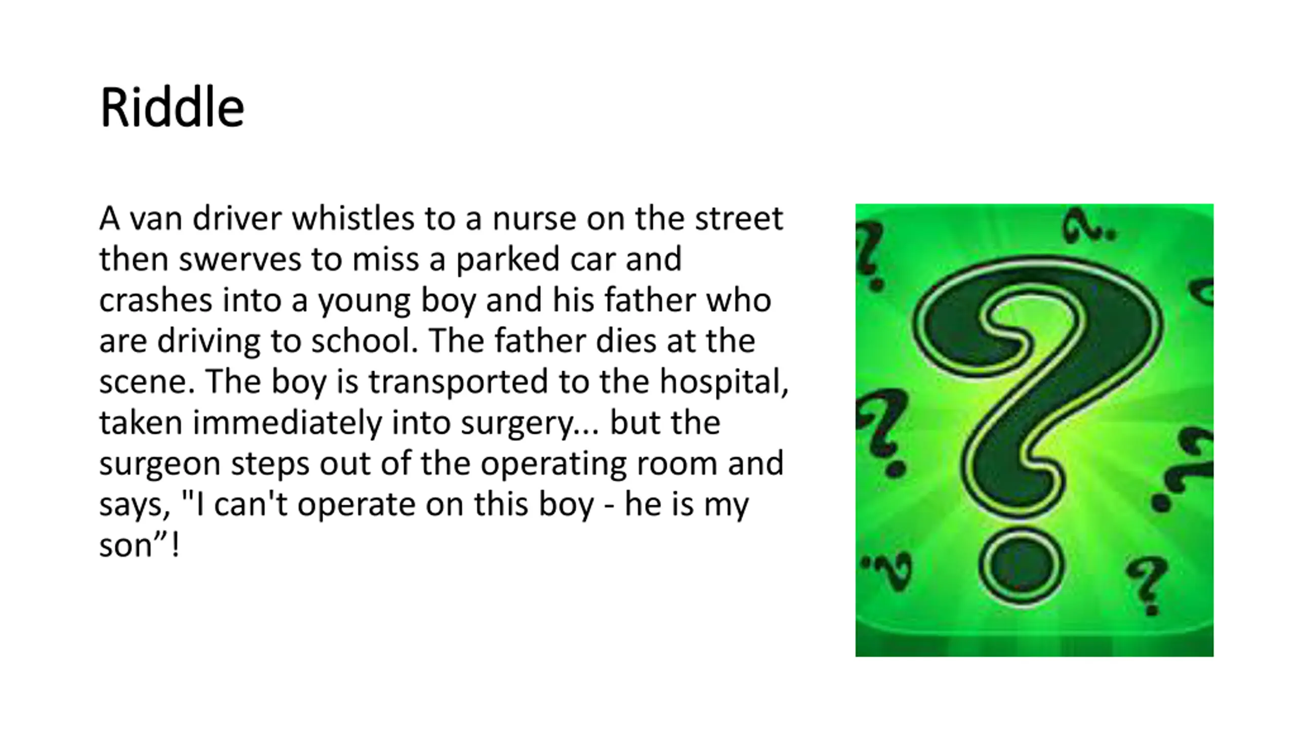Riddle Riddle A van driver whistles to a nurse on the street then swerves to miss a parked car and crashes into a young boy and his father who are driving to school. The father dies at the scene. The boy is transported to the hospital, taken immediately into surgery... but the surgeon steps out of the operating room and says, "I can't operate on this boy - he is my son !