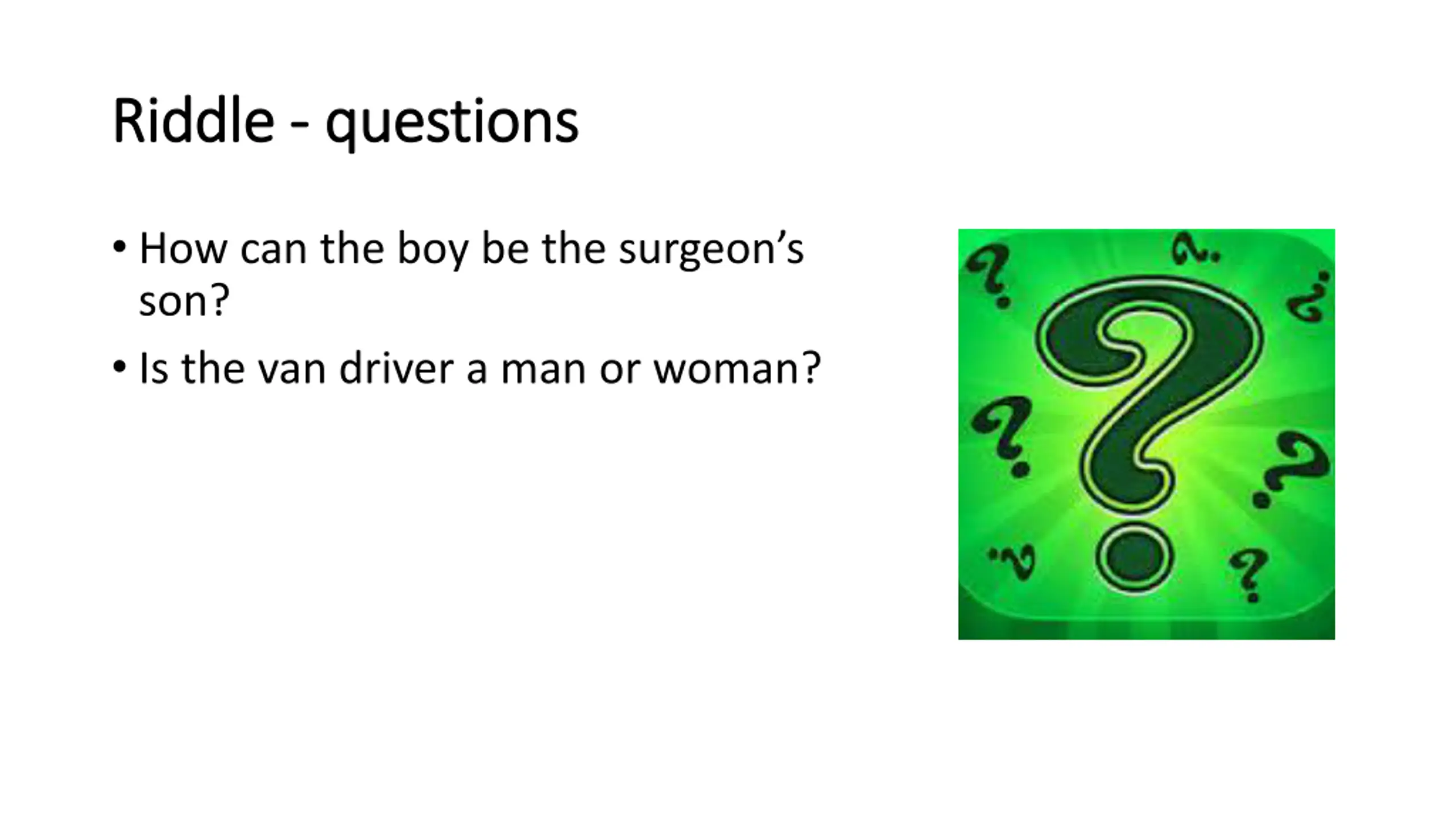 Riddle Riddle - - questions questions How can the boy be the surgeon s son? Is the van driver a man or woman?