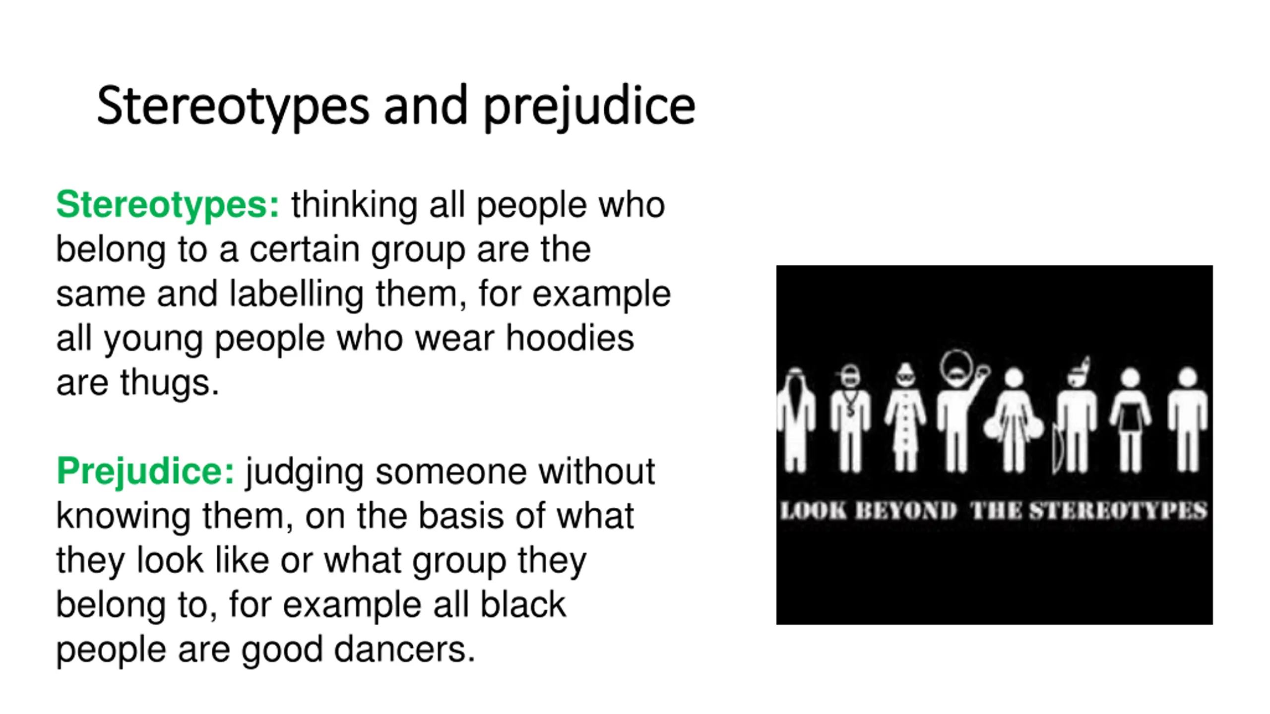Stereotypes and prejudice Stereotypes and prejudice Stereotypes: thinking all people who belong to a certain group are the same and labelling them, for example all young people who wear hoodies are thugs. Prejudice: judging someone without knowing them, on the basis of what they look like or what group they belong to, for example all black people are good dancers.