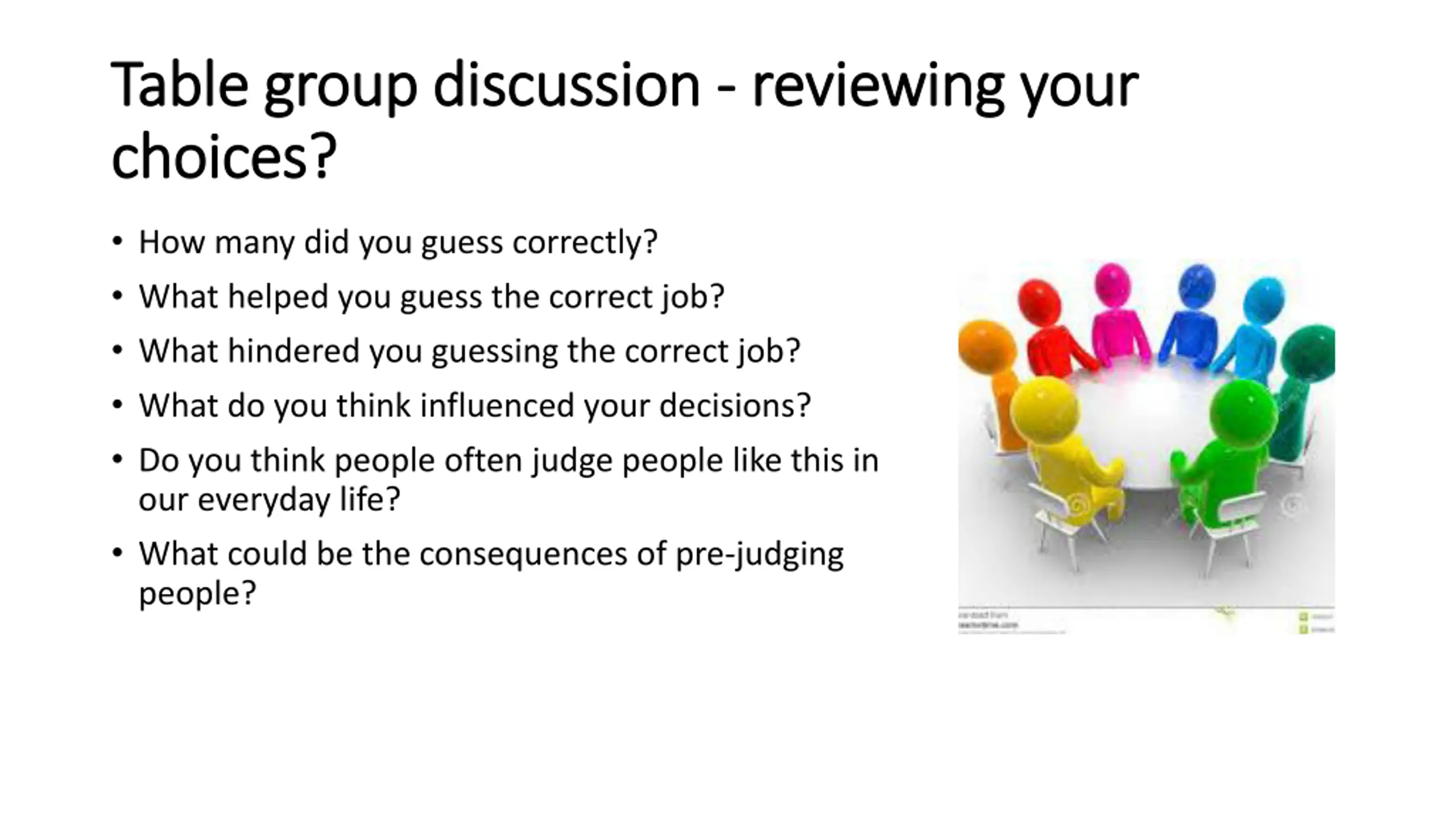 Table group discussion Table group discussion - - reviewing your choices? choices? reviewing your How many did you guess correctly? What helped you guess the correct job? What hindered you guessing the correct job? What do you think influenced your decisions? Do you think people often judge people like this in our everyday life? What could be the consequences of pre-judging people?