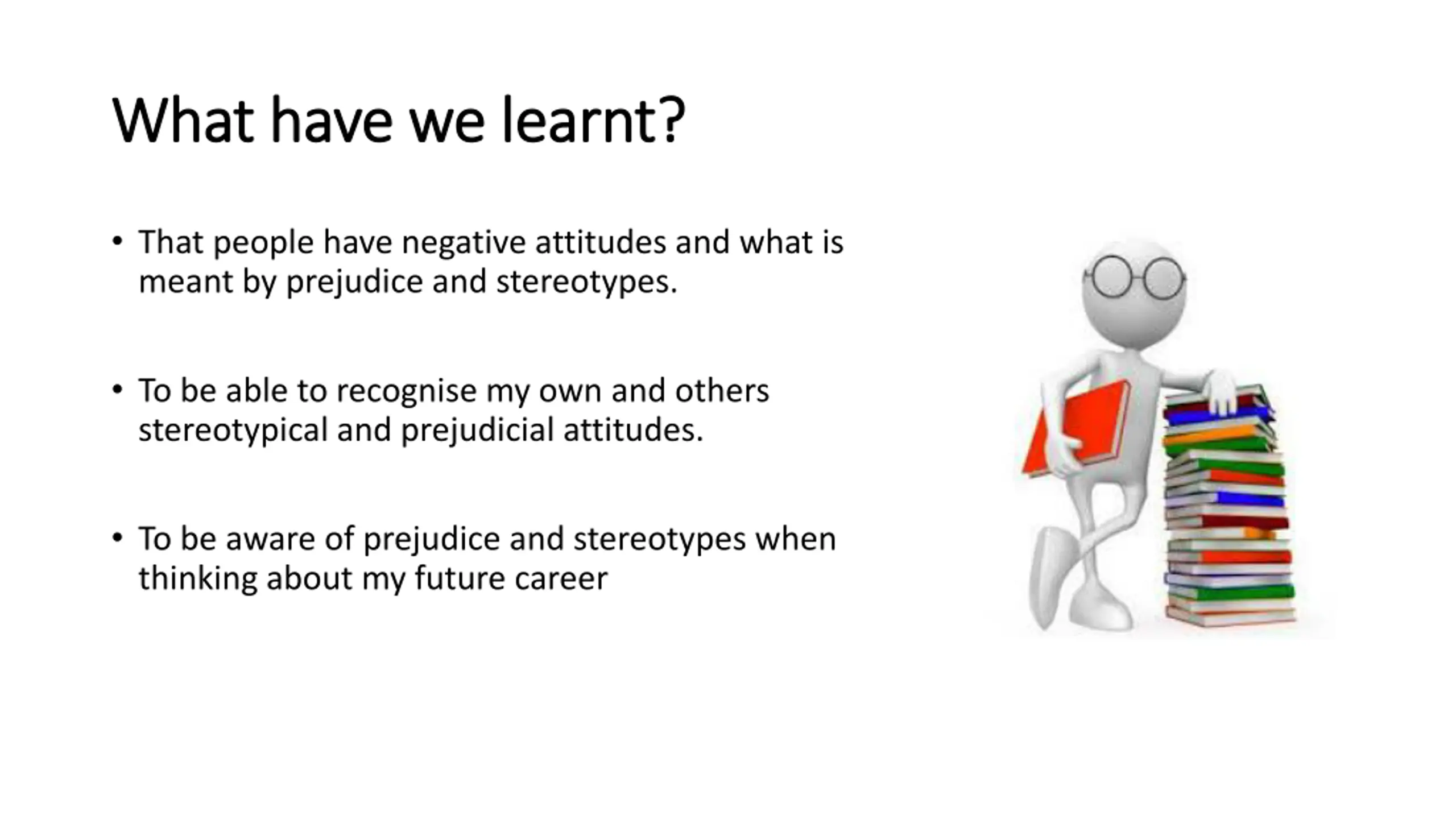 What have we learnt? What have we learnt? That people have negative attitudes and what is meant by prejudice and stereotypes. To be able to recognise my own and others stereotypical and prejudicial attitudes. To be aware of prejudice and stereotypes when thinking about my future career