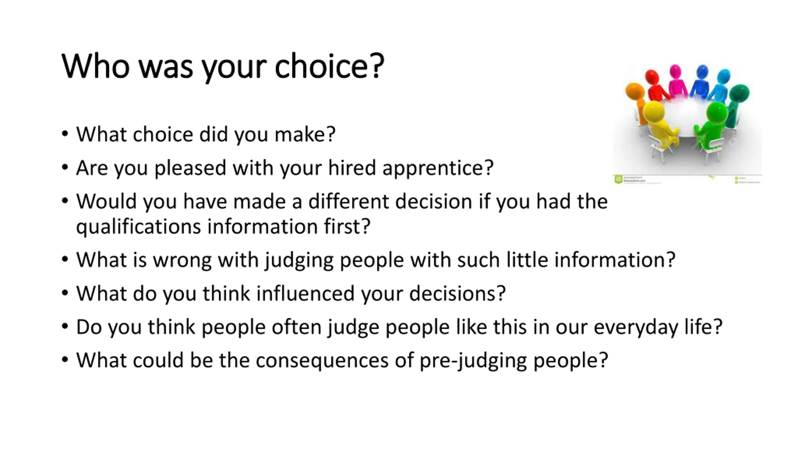 Who was your choice? Who was your choice? What choice did you make? Are you pleased with your hired apprentice? Would you have made a different decision if you had the qualifications information first? What is wrong with judging people with such little information? What do you think influenced your decisions? Do you think people often judge people like this in our everyday life? What could be the consequences of pre-judging people?