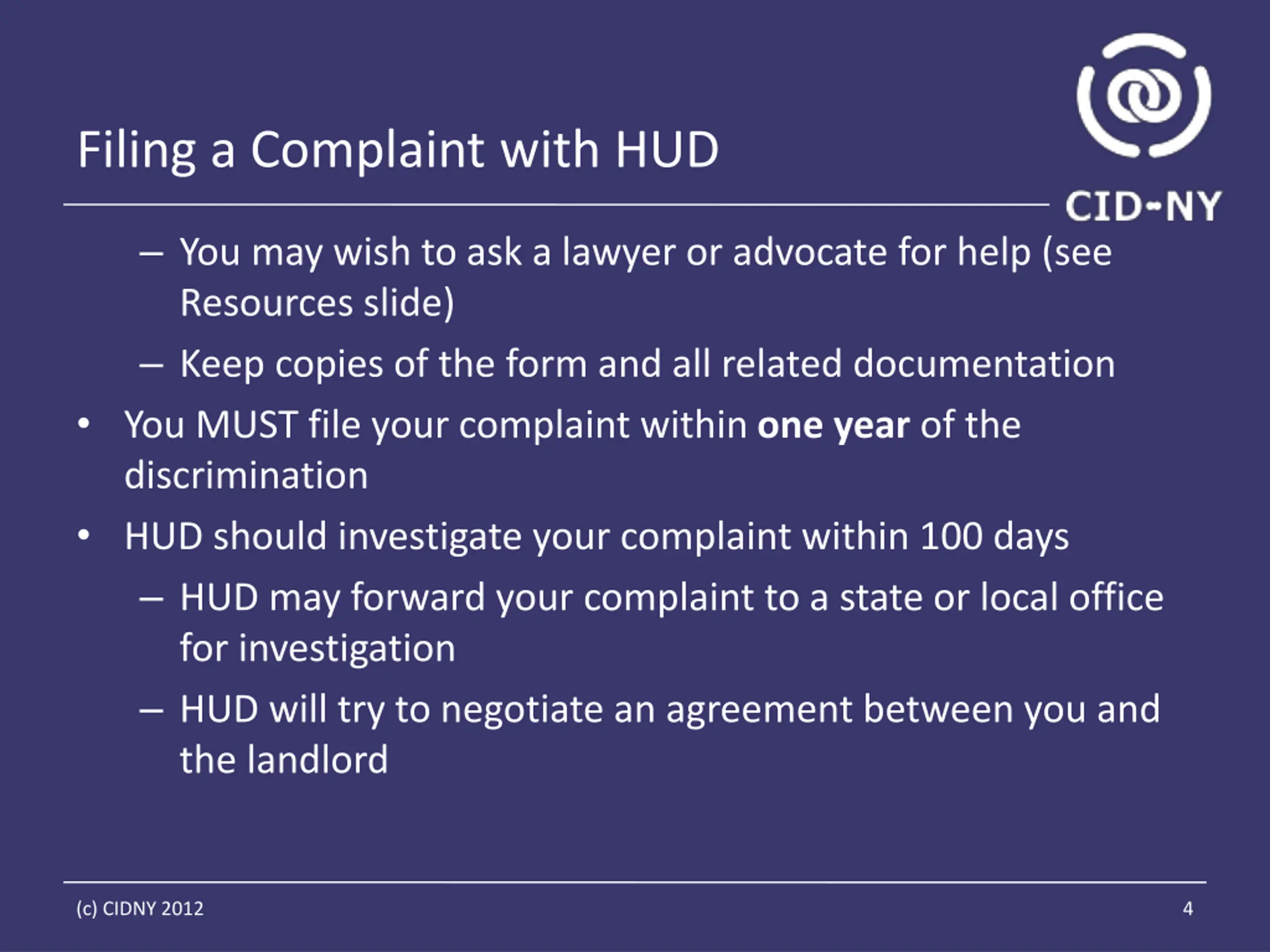Filing a Complaint with HUD You may wish to ask a lawyer or advocate for help (see Resources slide) Keep copies of the form and all related documentation You MUST file your complaint within one year of the discrimination HUD should investigate your complaint within 100 days HUD may forward your complaint to a state or local office for investigation HUD will try to negotiate an agreement between you and the landlord (c) CIDNY 2012 4