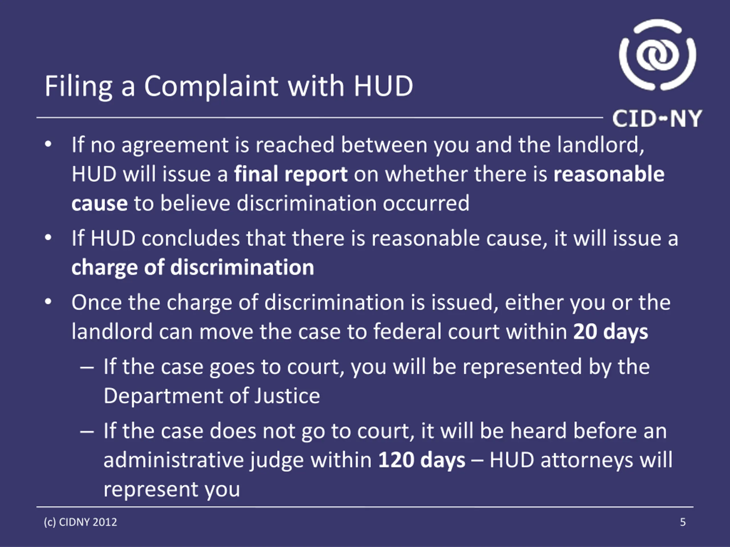 Filing a Complaint with HUD If no agreement is reached between you and the landlord, HUD will issue a final report on whether there is reasonable cause to believe discrimination occurred If HUD concludes that there is reasonable cause, it will issue a charge of discrimination Once the charge of discrimination is issued, either you or the landlord can move the case to federal court within 20 days If the case goes to court, you will be represented by the Department of Justice If the case does not go to court, it will be heard before an administrative judge within 120 days HUD attorneys will represent you (c) CIDNY 2012 5