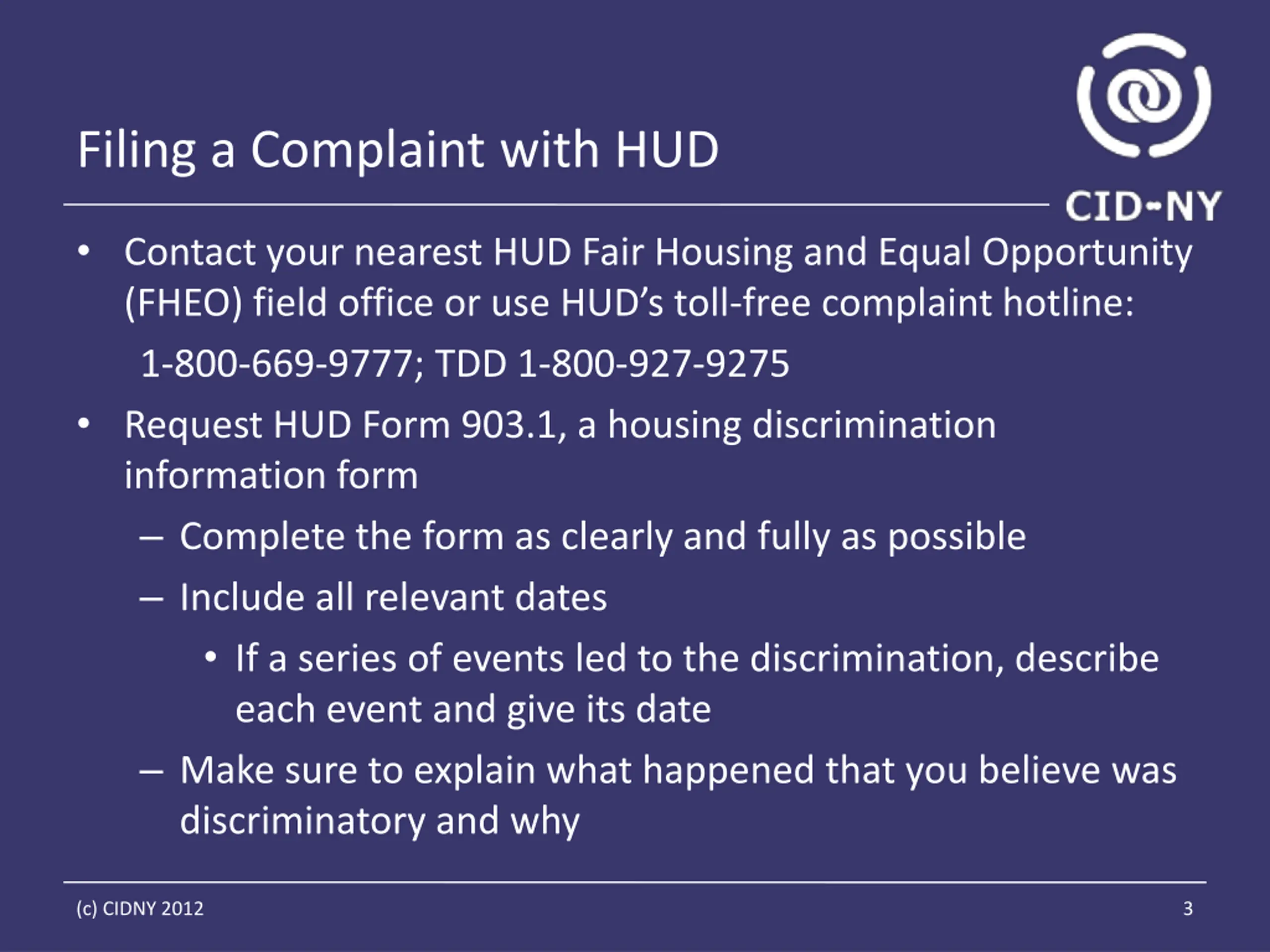 Filing a Complaint with HUD Contact your nearest HUD Fair Housing and Equal Opportunity (FHEO) field office or use HUD s toll-free complaint hotline: 1-800-669-9777; TDD 1-800-927-9275 Request HUD Form 903.1, a housing discrimination information form Complete the form as clearly and fully as possible Include all relevant dates If a series of events led to the discrimination, describe each event and give its date Make sure to explain what happened that you believe was discriminatory and why (c) CIDNY 2012 3