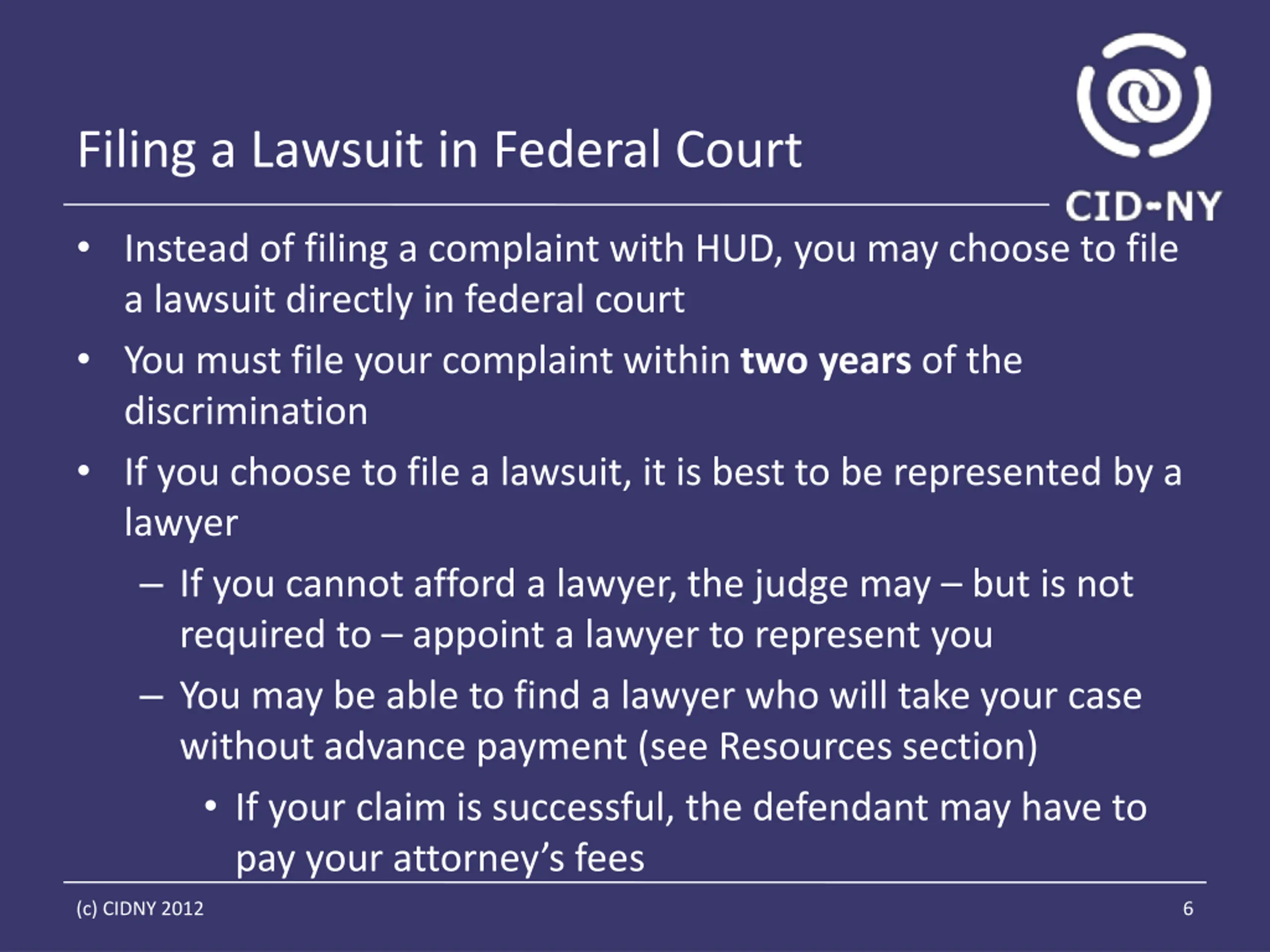 Filing a Lawsuit in Federal Court Instead of filing a complaint with HUD, you may choose to file a lawsuit directly in federal court You must file your complaint within two years of the discrimination If you choose to file a lawsuit, it is best to be represented by a lawyer If you cannot afford a lawyer, the judge may but is not required to appoint a lawyer to represent you You may be able to find a lawyer who will take your case without advance payment (see Resources section) If your claim is successful, the defendant may have to pay your attorney s fees (c) CIDNY 2012 6